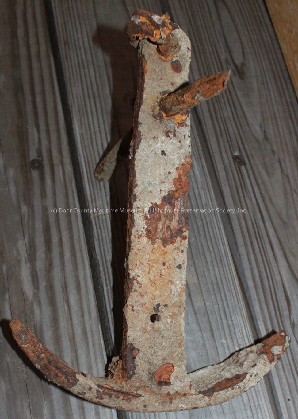 Rusty metal w/material attached. Rod through shank near top, ring at top, flukes bent up in half circle.