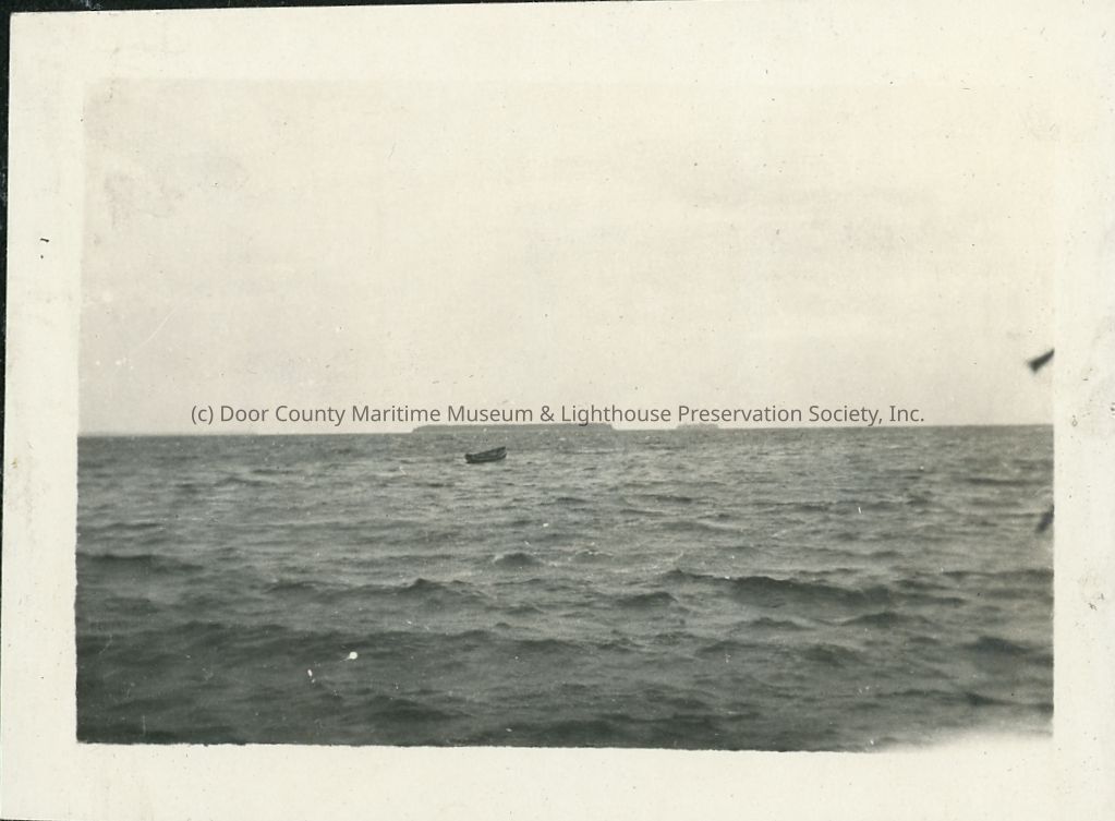 Boat anchored with islands in background. Identified as the Evinrude.
