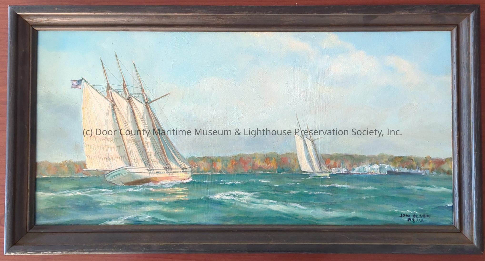 Oil Painting in black frame. Depicts two schooners on the open water with multi-colored tree in the backgroundLocation