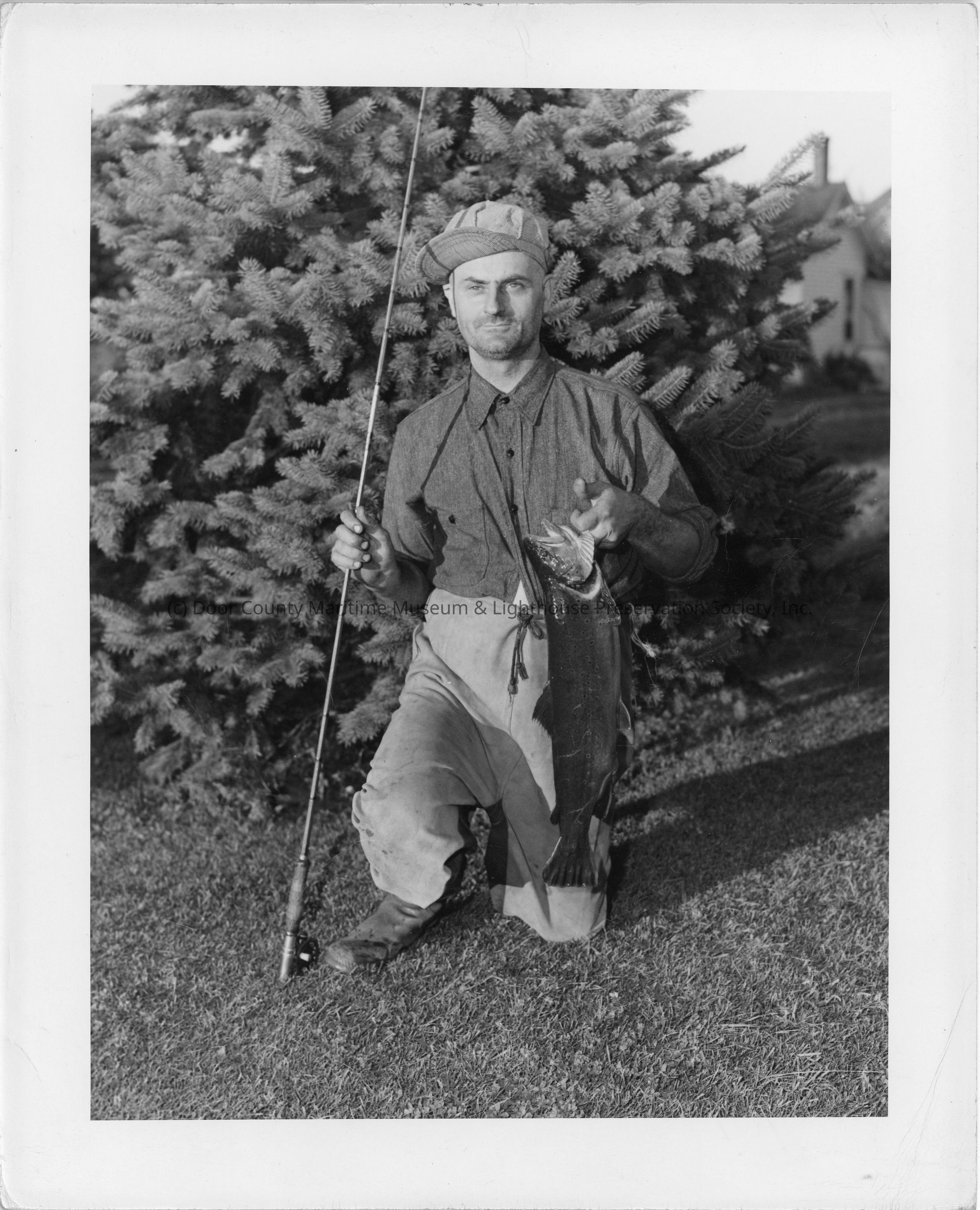 Archie Deni kneeling on grass holding German brown trout August 27, 1947Entry/Object ID