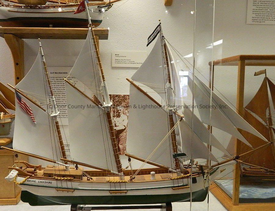 On wood varnished stand; Schooner "Archie Lackshire"; green and white hull; painted white wood sails; black and white lines; 3 masts; painted in black on stern Archie Lackshire; white life boat at stern; varnished deck; two white capstans; two black anchors; American flag; red A.L. flag; black and white Archie Lackshire flag.