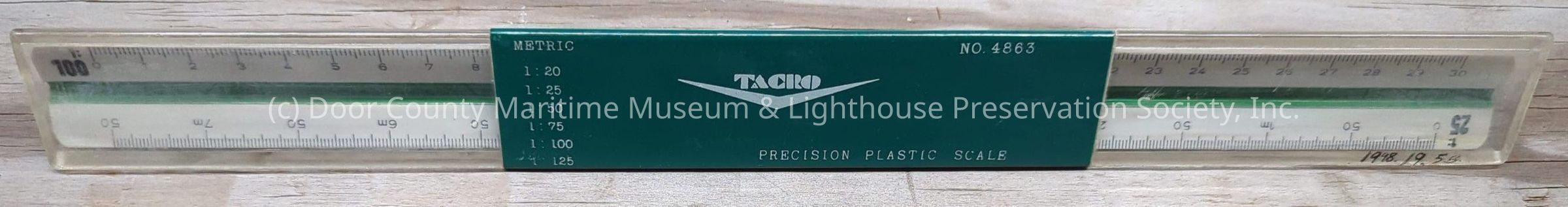 White clear case with green and white center. Each side of the triangular scale has center color bar running length of scale
