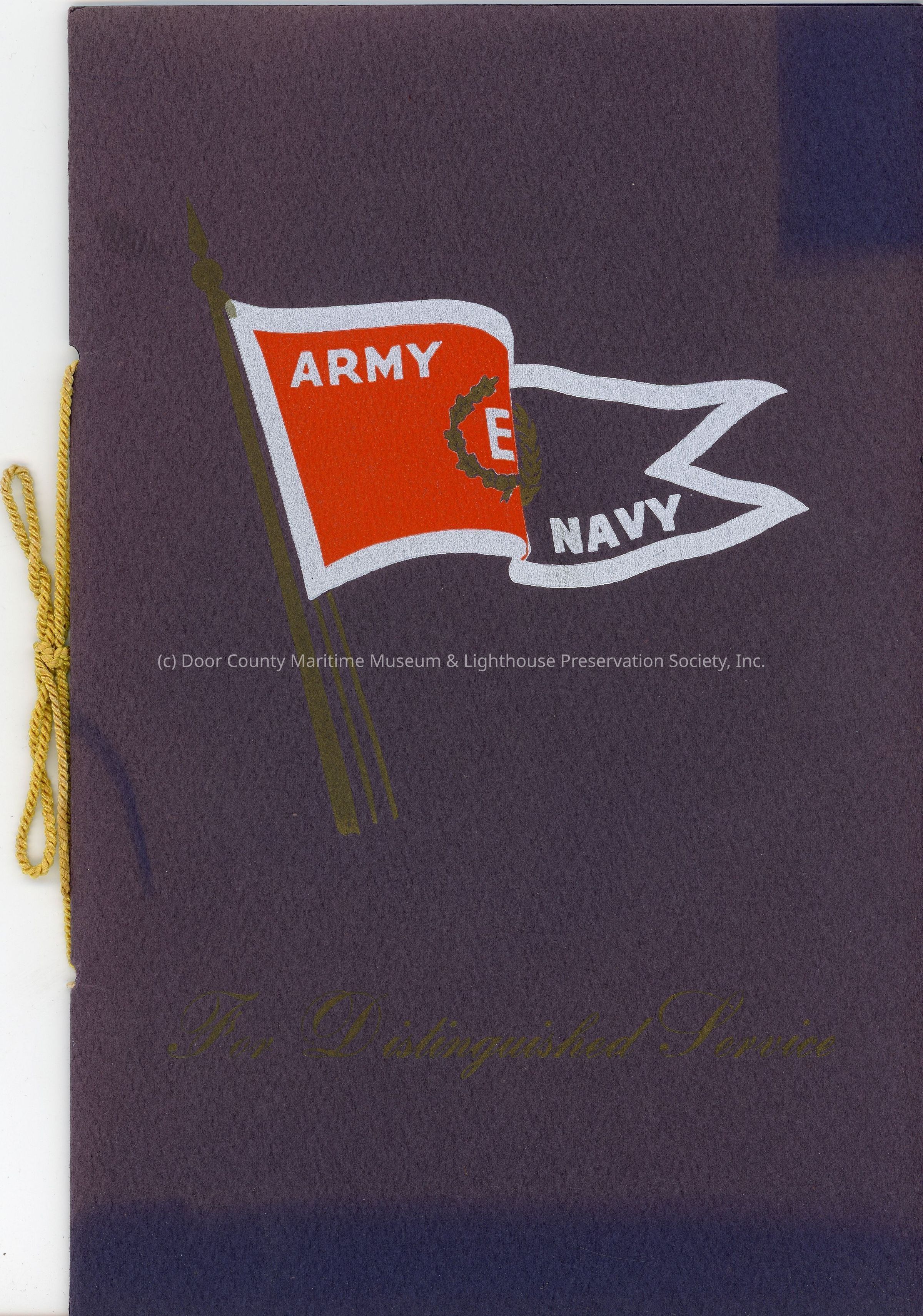 Soft cover; navy blue with red, white, and blue E flag; gold print; gold cord; "For Distinguished Service" Army - Navy "E" production award presented to the employees and management of the Leathem D. Smith Shipbuilding Co., Sturgeon Bay, Wisconsin, Wednesday, March 10, 1943"; cover slightly dirty.Location