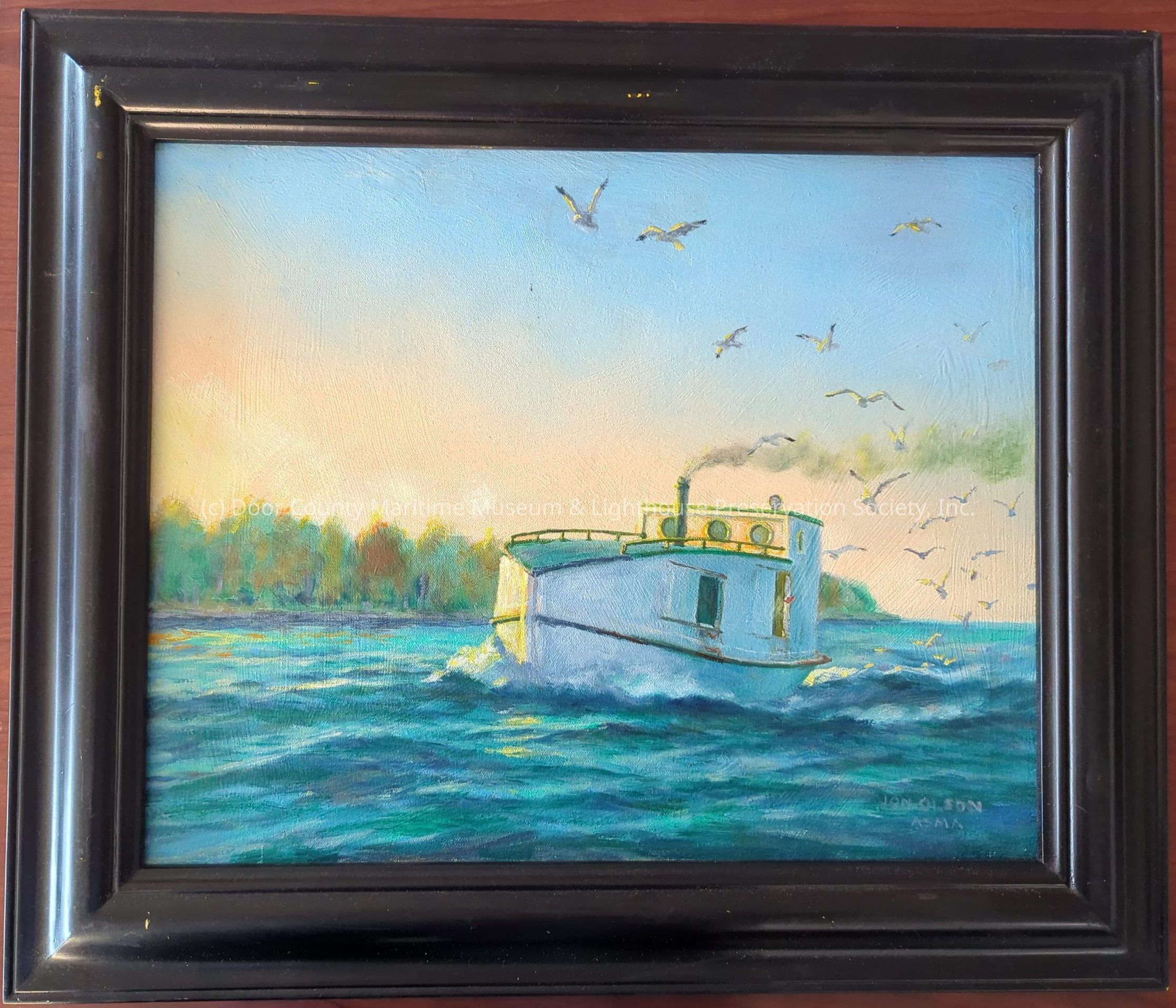 Oil Painting in black frame. Depicts a green and white fishing tug on the water with smoking billowing out of exhaust. Seagull are flying overhead. Trees in the backgroundLocation