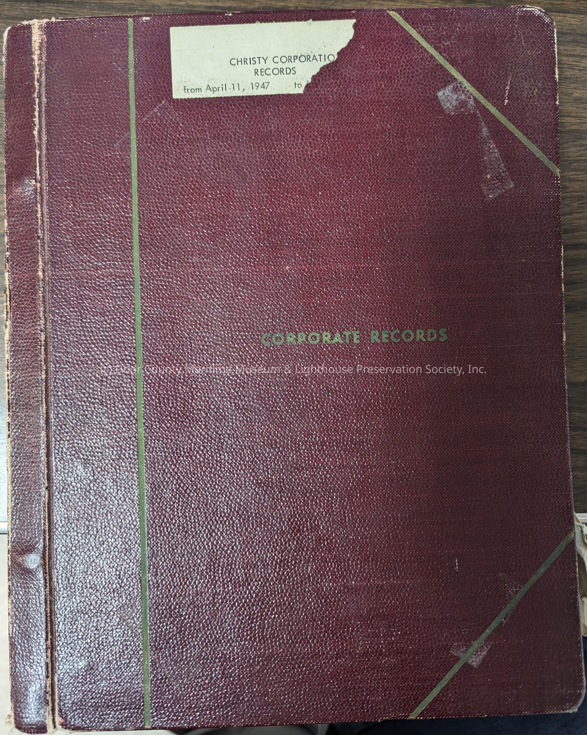 Maroon hard cover with gold trim and white label "Christy Corporation records from April 11, 1947Location