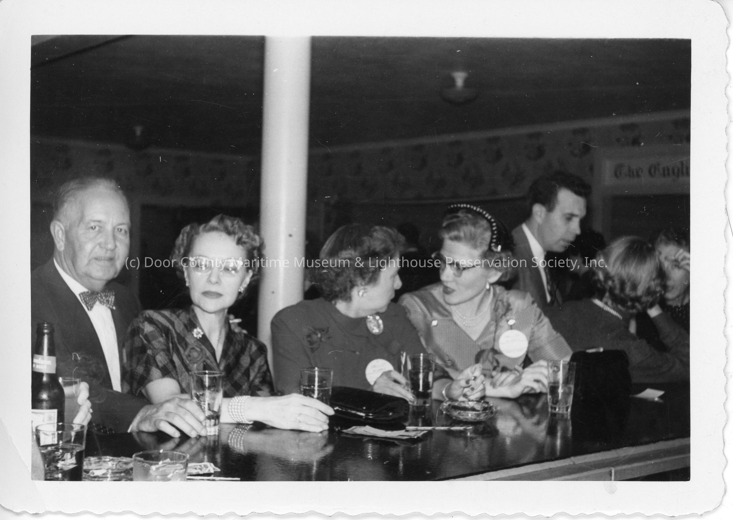 Colorless photograph of Navy Office Party. One man and three women at a bar.Location