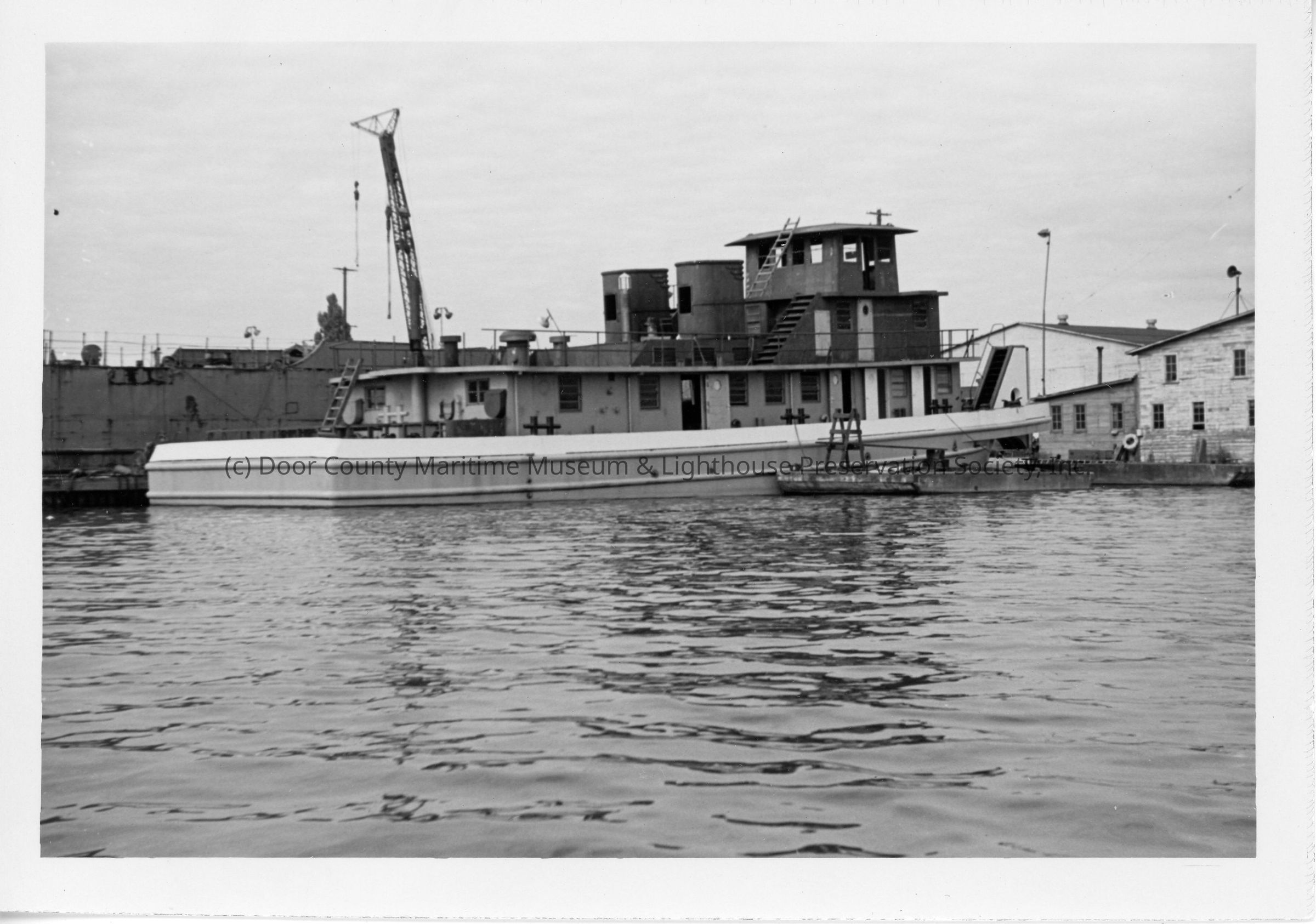 Colorless photograph. Depicts barge tug at shore. Crane and buildings in background