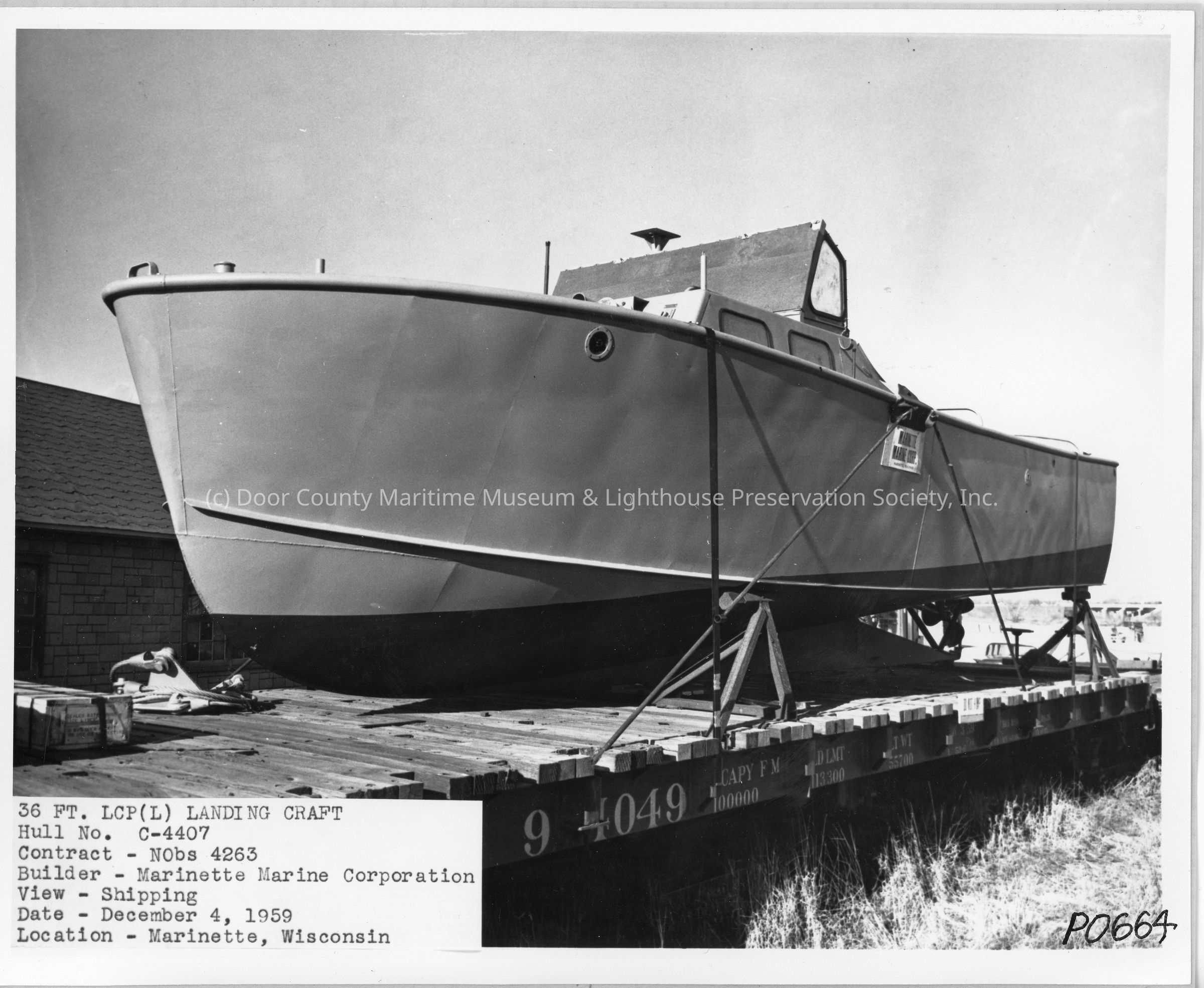 36' LCP landing craft C-4407 on trailer in Marinette, Wisconsin, on December 4, 1959