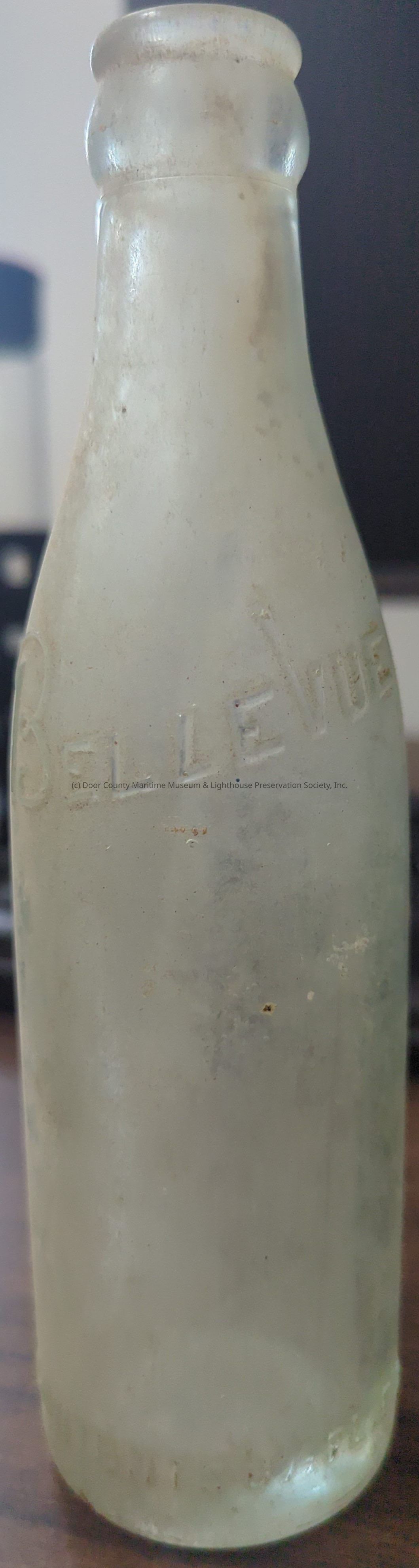 Transparent glass bottle with text "Bellevue Contents 6 1/2 FL.OZ" in raised letters on front of bottle