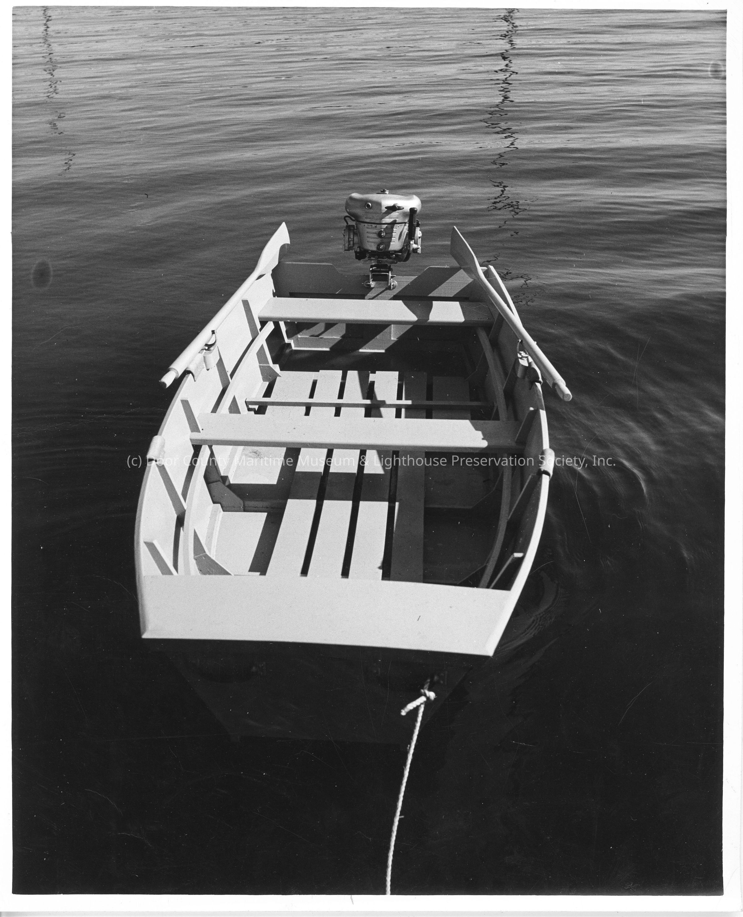 Blunt nose rowboat with outboard motor attached October 11, 1944