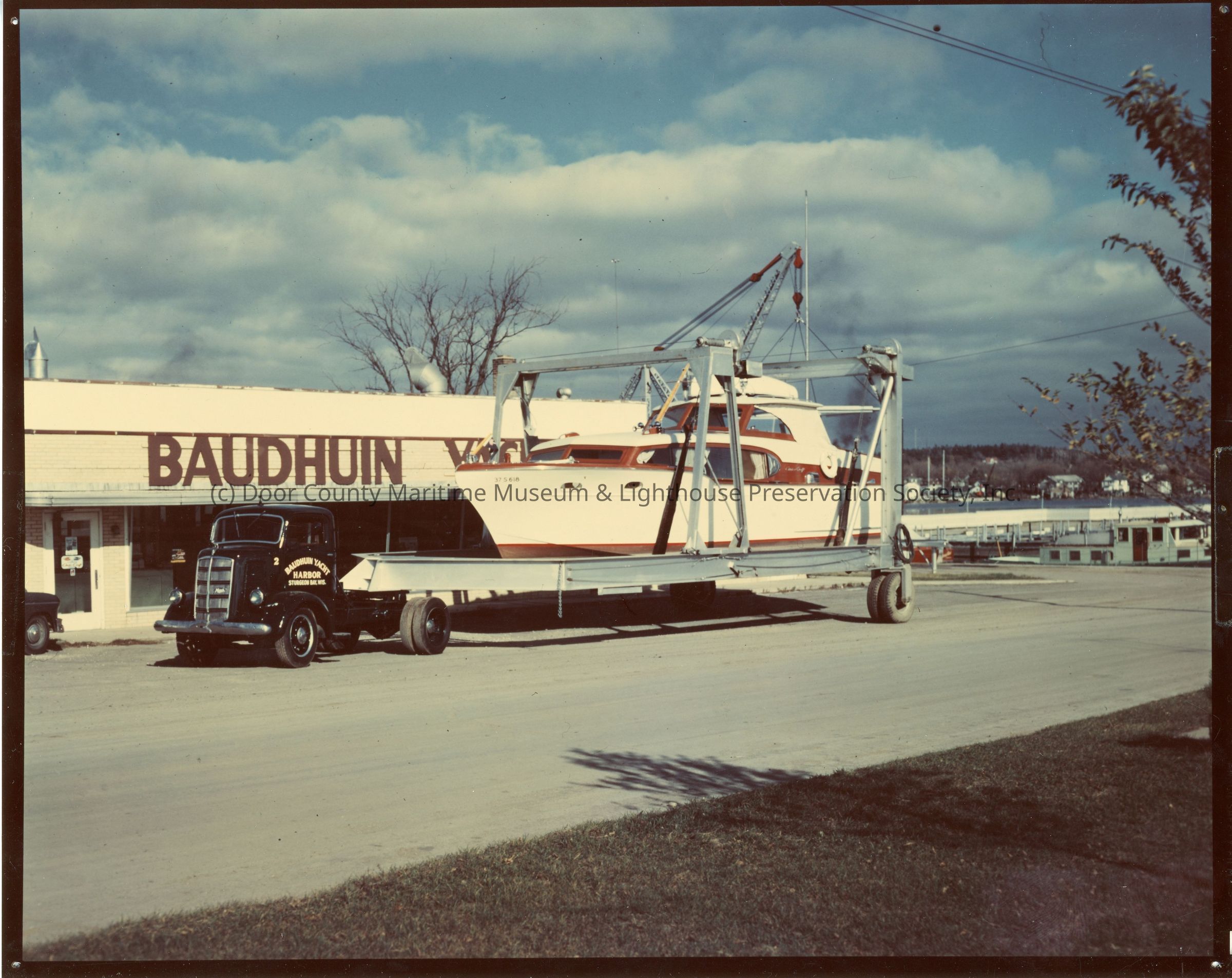 Boat in lift in fornt of Baudhuin Yacht Harobr BuildingEntry/Object ID
