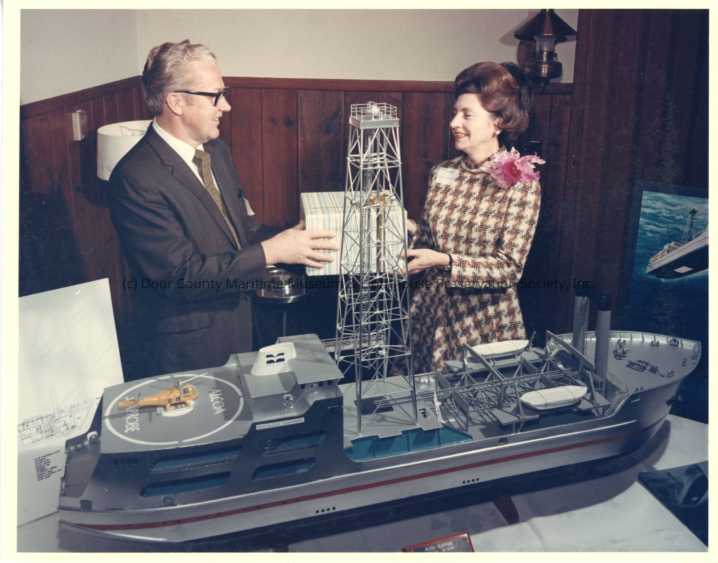Bob Peterson giving Mrs. Woodward a present at Alcoa Seaprobe christeningEntry/Object ID