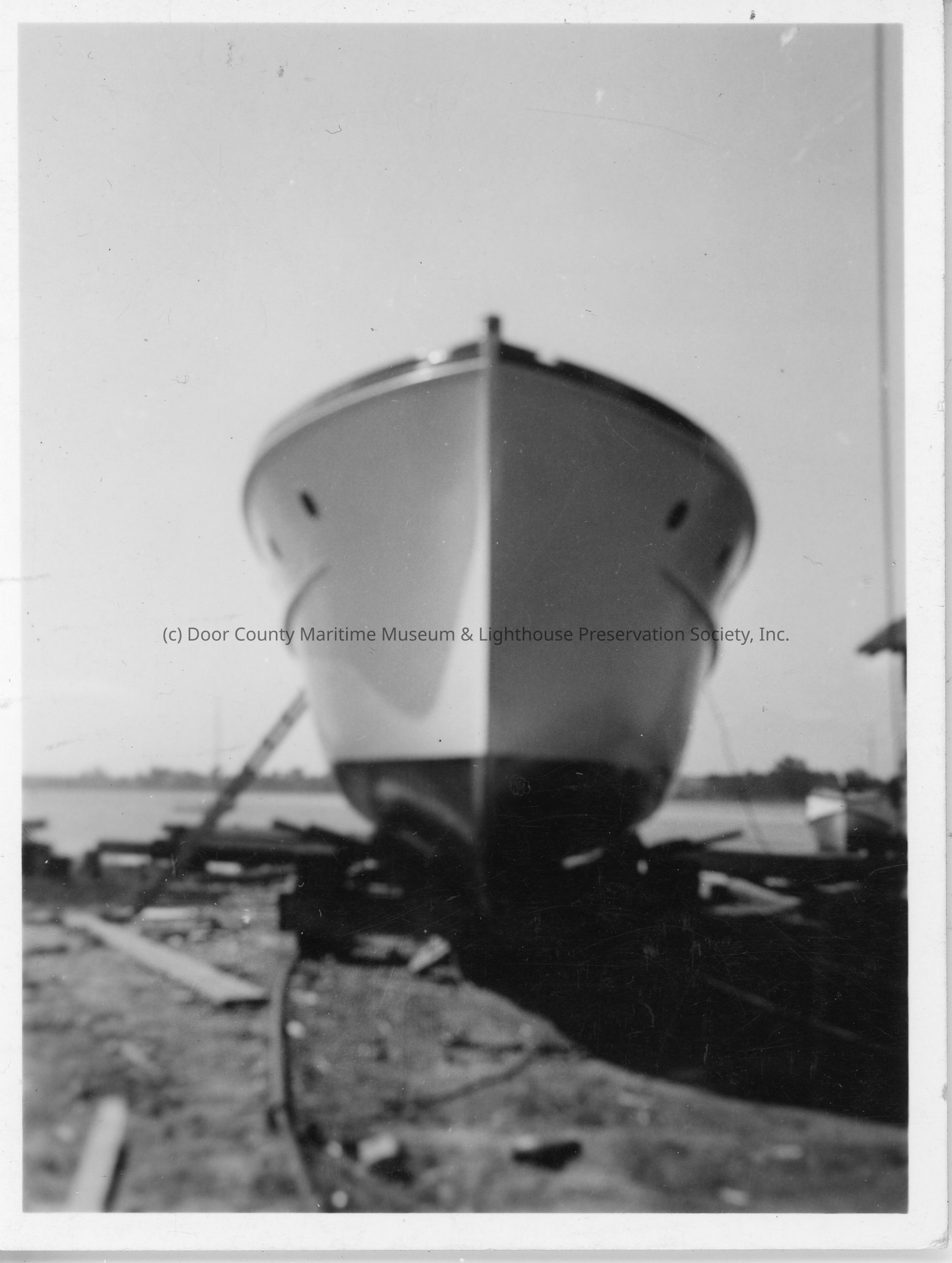 Bow of Ronaele II on cribbing at Peterson Boat Works