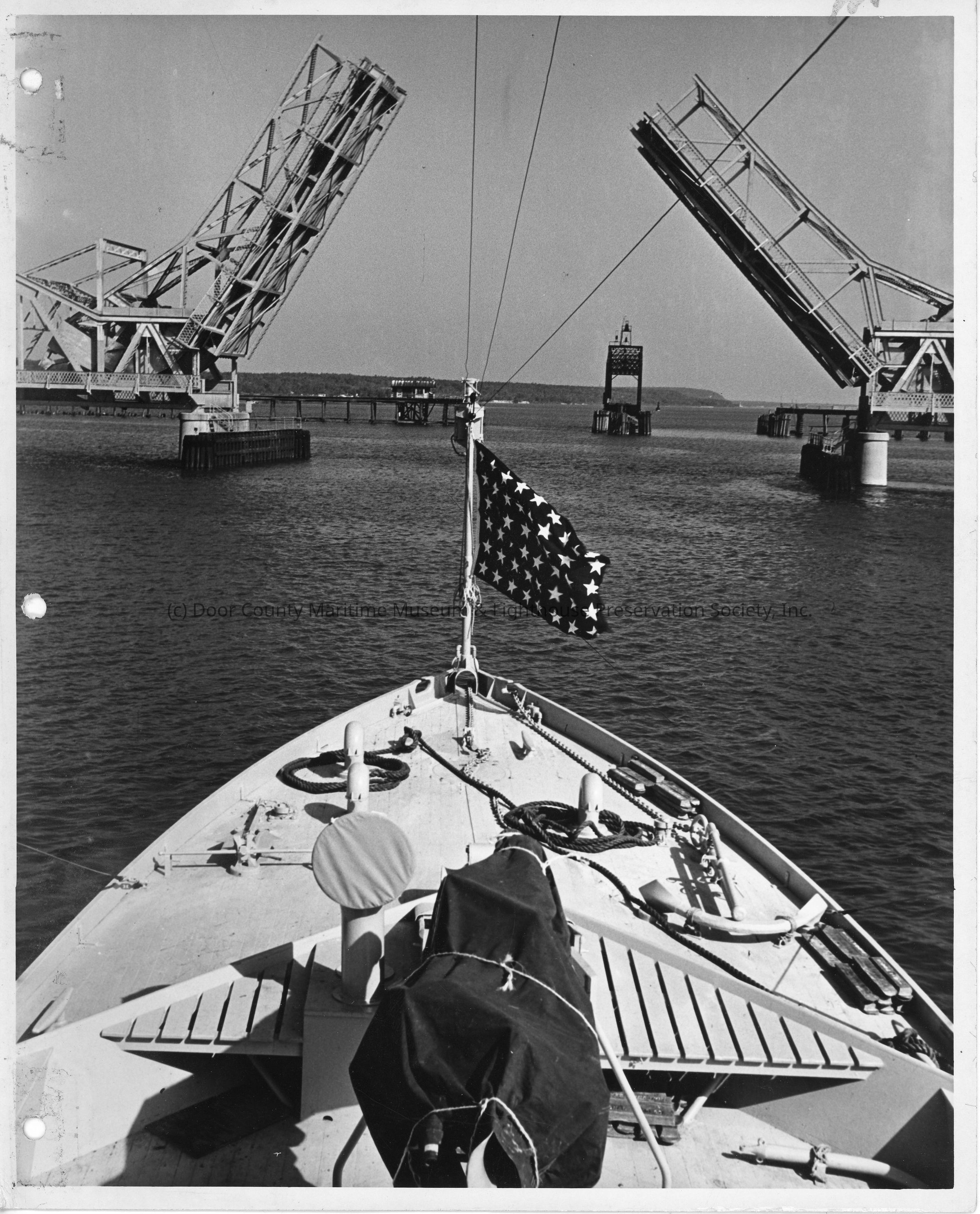 Bow view of SC-642 in Bay of Sturgeon Bay with Michigan Street Bridge and railroad bridge in background July 18, 1942Entry/Object ID