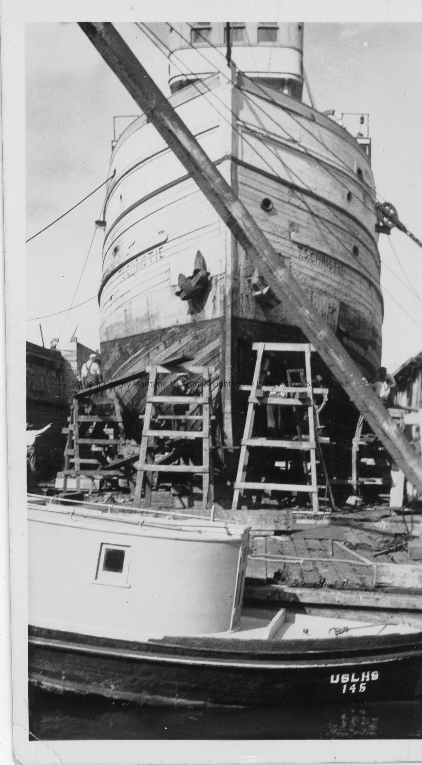 Bow view of T.S Christie in drydock with USLHS 145 docked in foreground