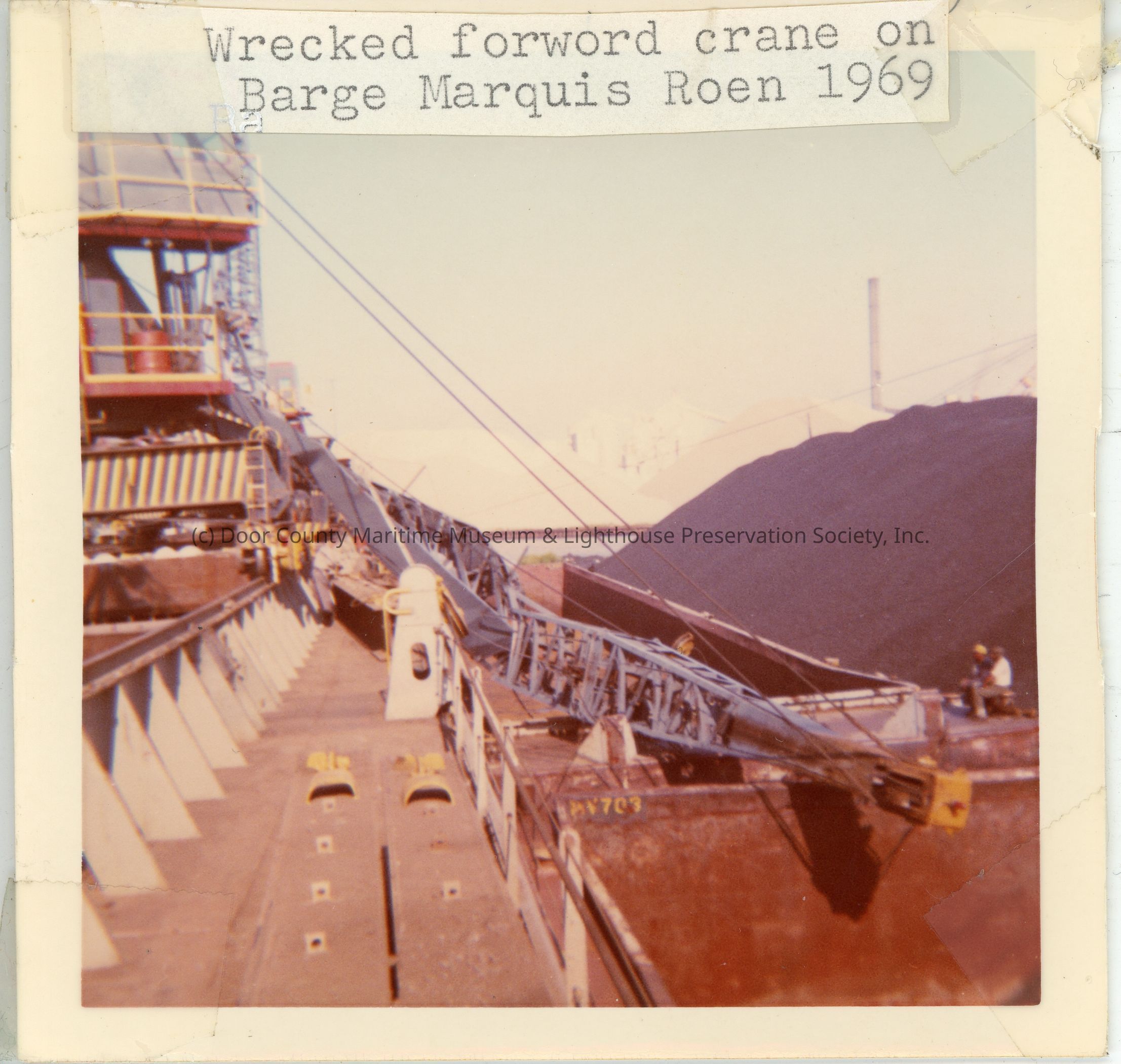 Broken forward crane on barge Marquis Roen 1969Entry/Object ID