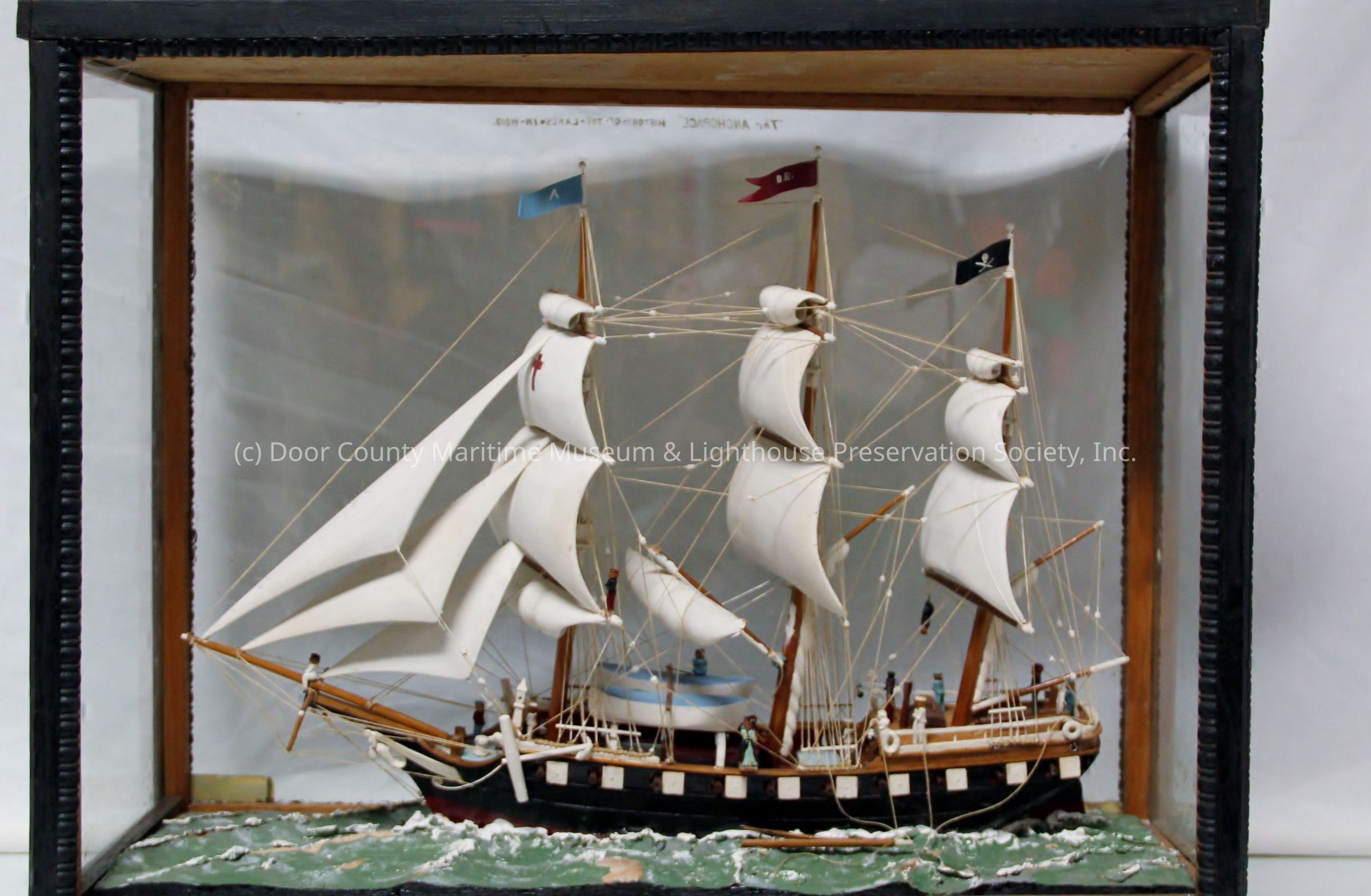 case painted black wood; glass; painted in white at top of glass "The Anchorage" History of the Lakes in wood: on other side Come and Have a Whale of a Sale; at hull Sturgeon Bay; model of "Bucket-o-Bloods; black and red hull; three masts; white sails; on top of masts blue flag A; red flag BB; Black flag X; two white lifeboats; blue covering; men on deck and cross dam of sails; set in blue-green water with white waves