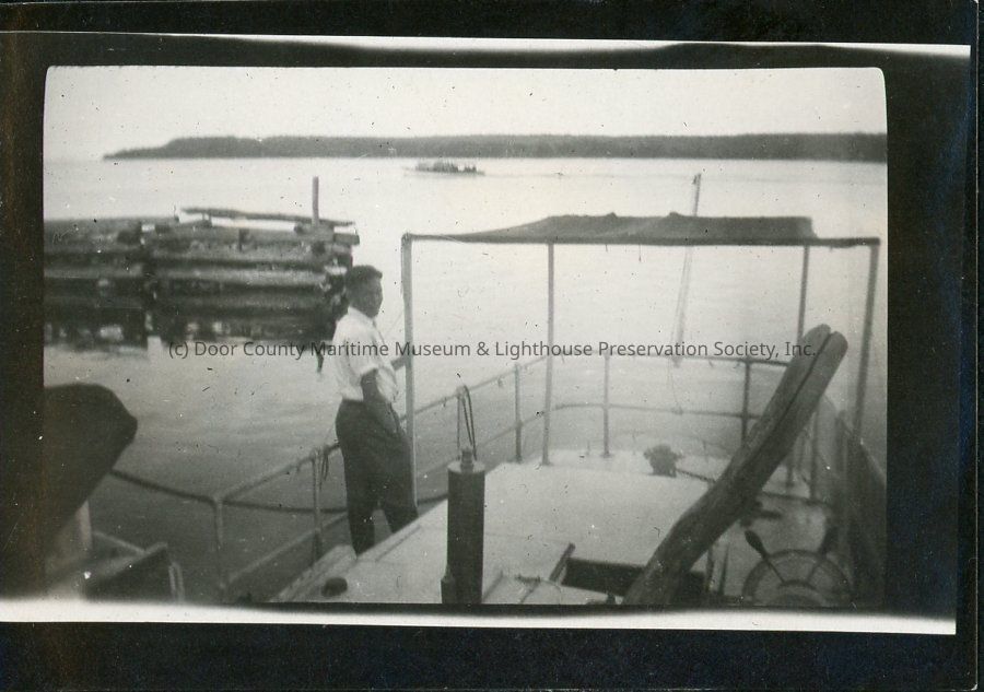 Buddy Kleinschmidt standing on the stern deck of the Oweenee while docked.