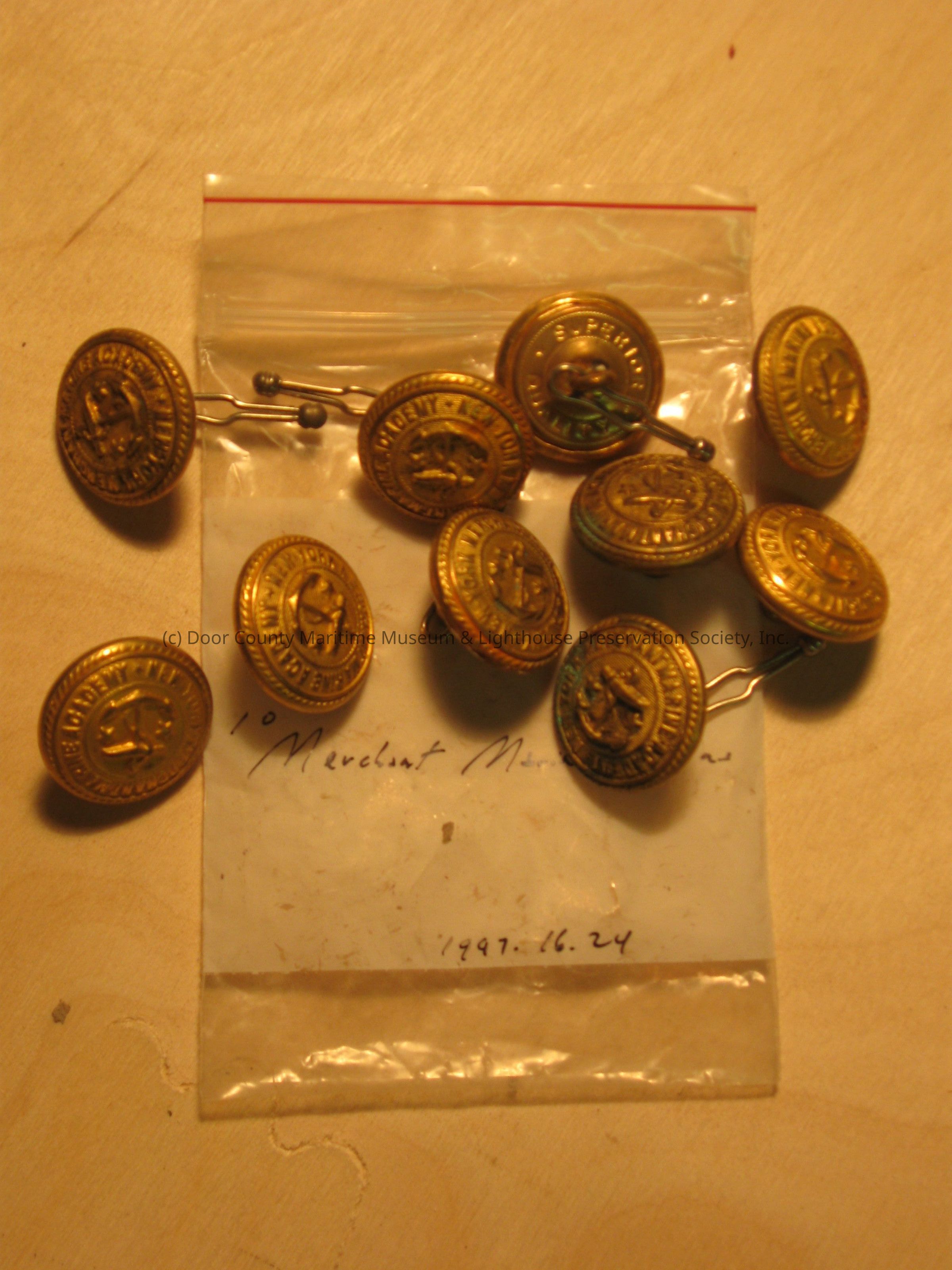 Ten brass uniform buttons. Merchant Mariner Academy, New York