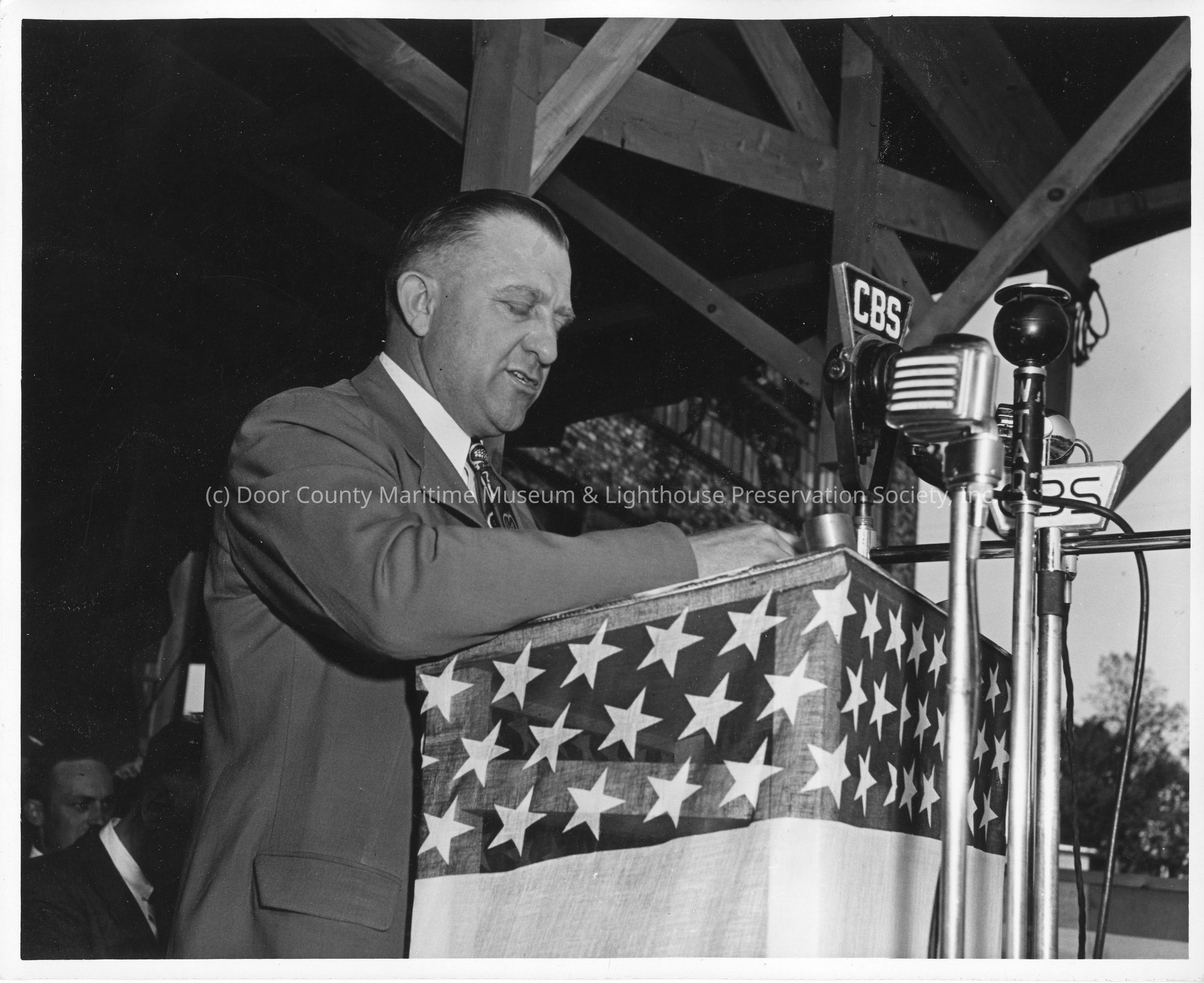 C. Ray Christianson speaking at podium at Leathem D. Smith Shipbuilding co.