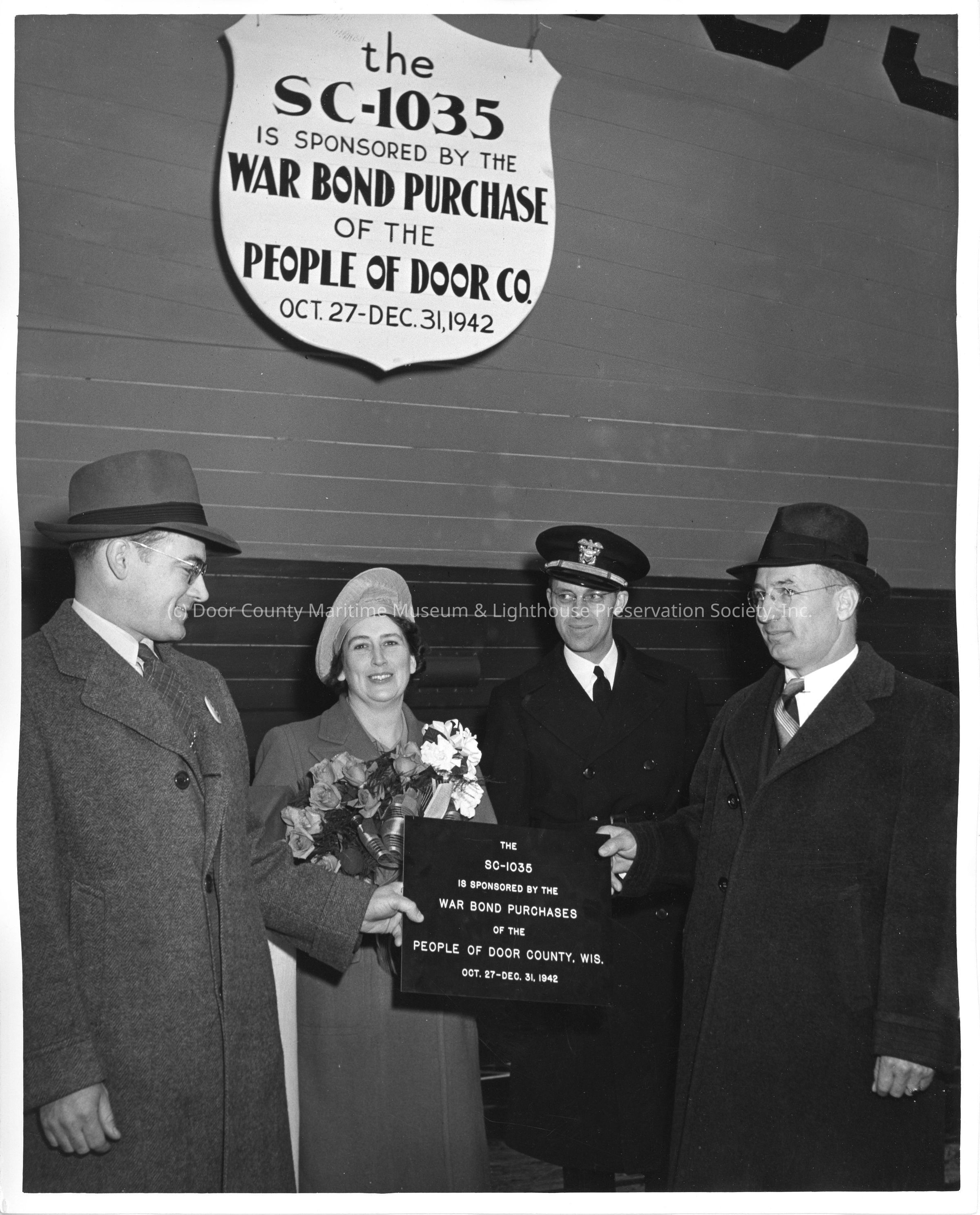 C.H. Herlache, Fred Peterson, and E.A. Anderson and ship sponsor at christening of SC-1035 April 12, 1942Entry/Object ID