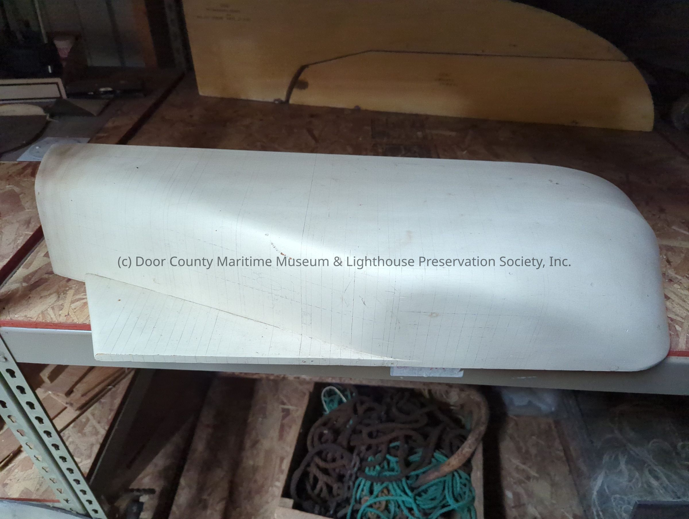 Half model of vessel Jamie A. Baxter. Shell platting. Cream colored with pencil lines. Two silver metal hanging brackets. Back is natural wood