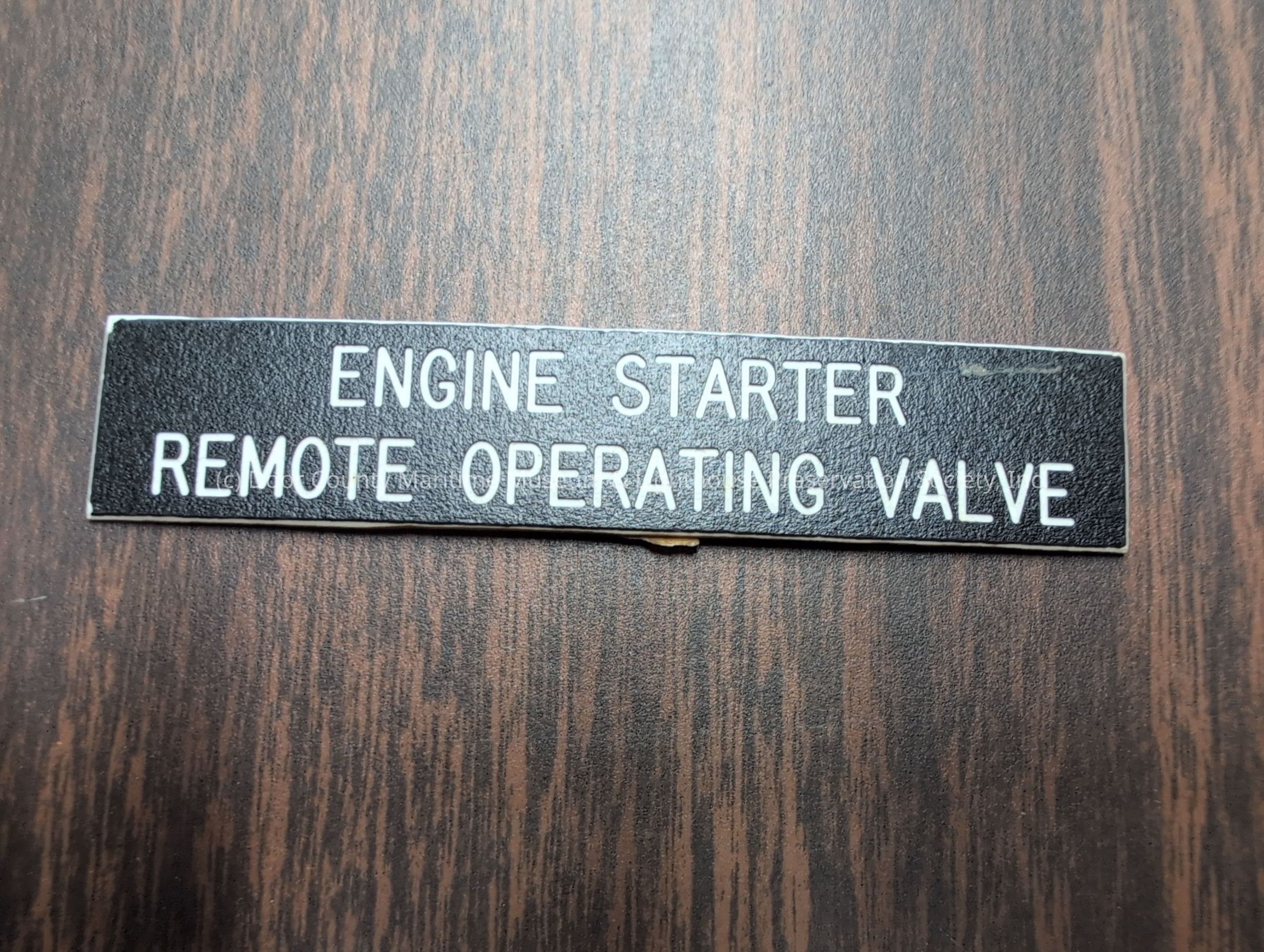 Wooden nameplate stating "Engine Starter Remote Operating Valve"