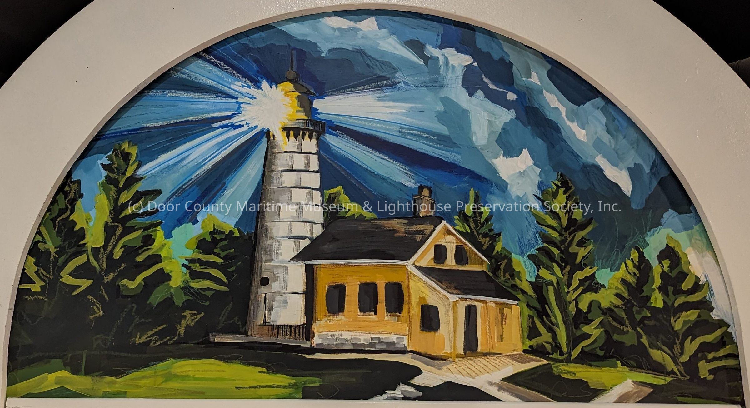 Wooden cemi-circle with the Cana Island Lighthouse painted on the front.