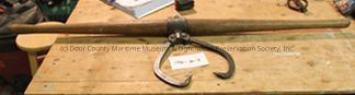 Cant hook: wood handle 53", two black metal hooks 10" held to center of handle by a metal bracket; hooks are moveable; wood handle cracked and well worn; used to lift/carry logs.