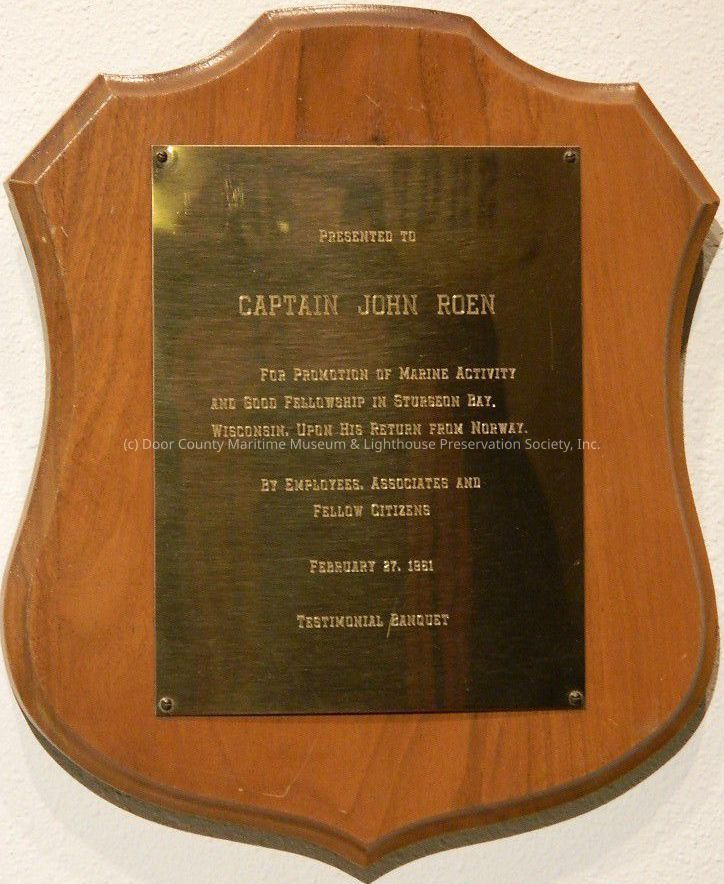 Varnished wood plaque with chain on back for hanging; back painted brown; "Presented to Captain John Roen for promotion of Marine Activity & Good Fellowship in Sturgeon Bay, Wisconsin, upon his return from Norway."Location