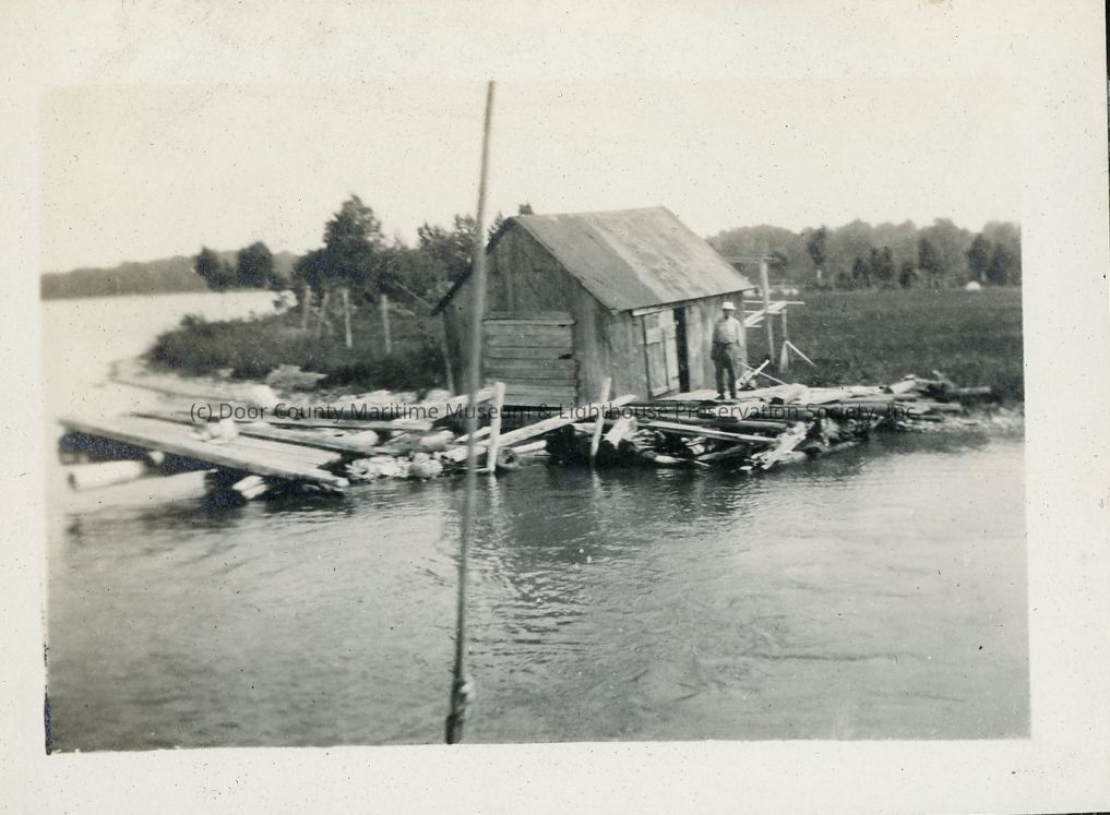 Man stands in front of building identified in album as Capt. Pedersen's dock.