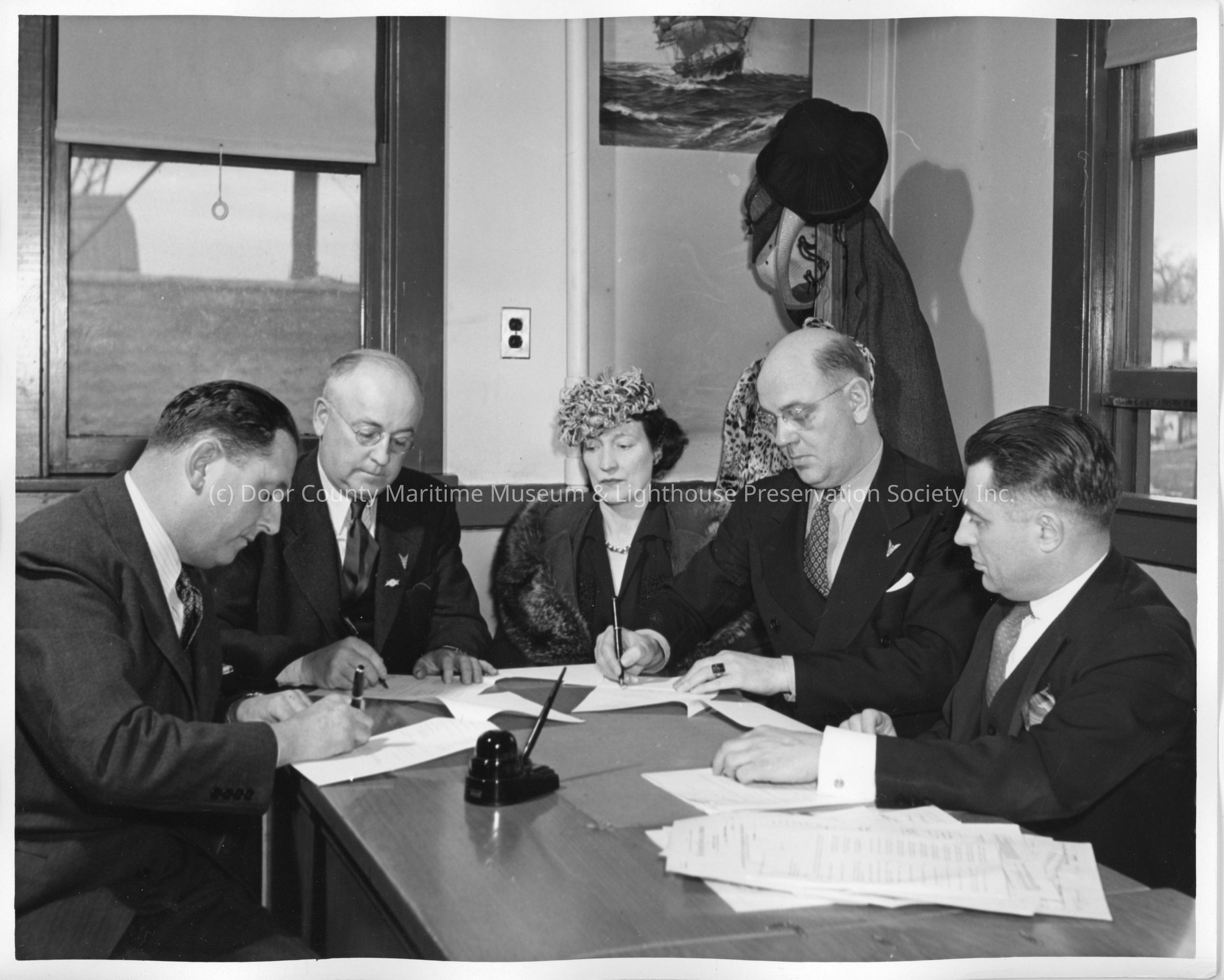 Captain Polking Horne, L.D. Smith, Mrs. Gallieane, Rob Carruthers signing documentationEntry/Object ID