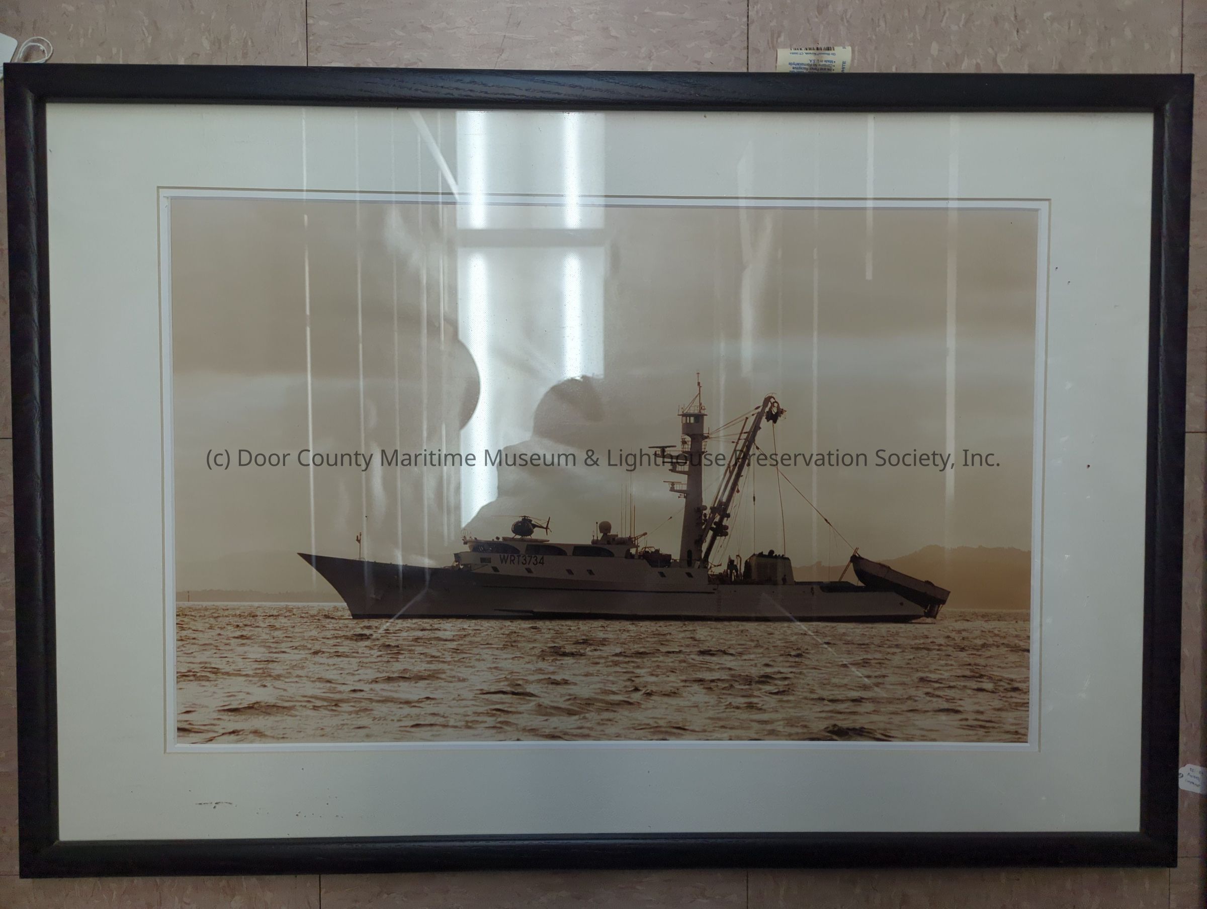 Color photograph of tuna seiner "Carolyn M" WRT3734 underway; predominantly gray hues; black wood frame; white mat; glass; wire hanger on back.Location