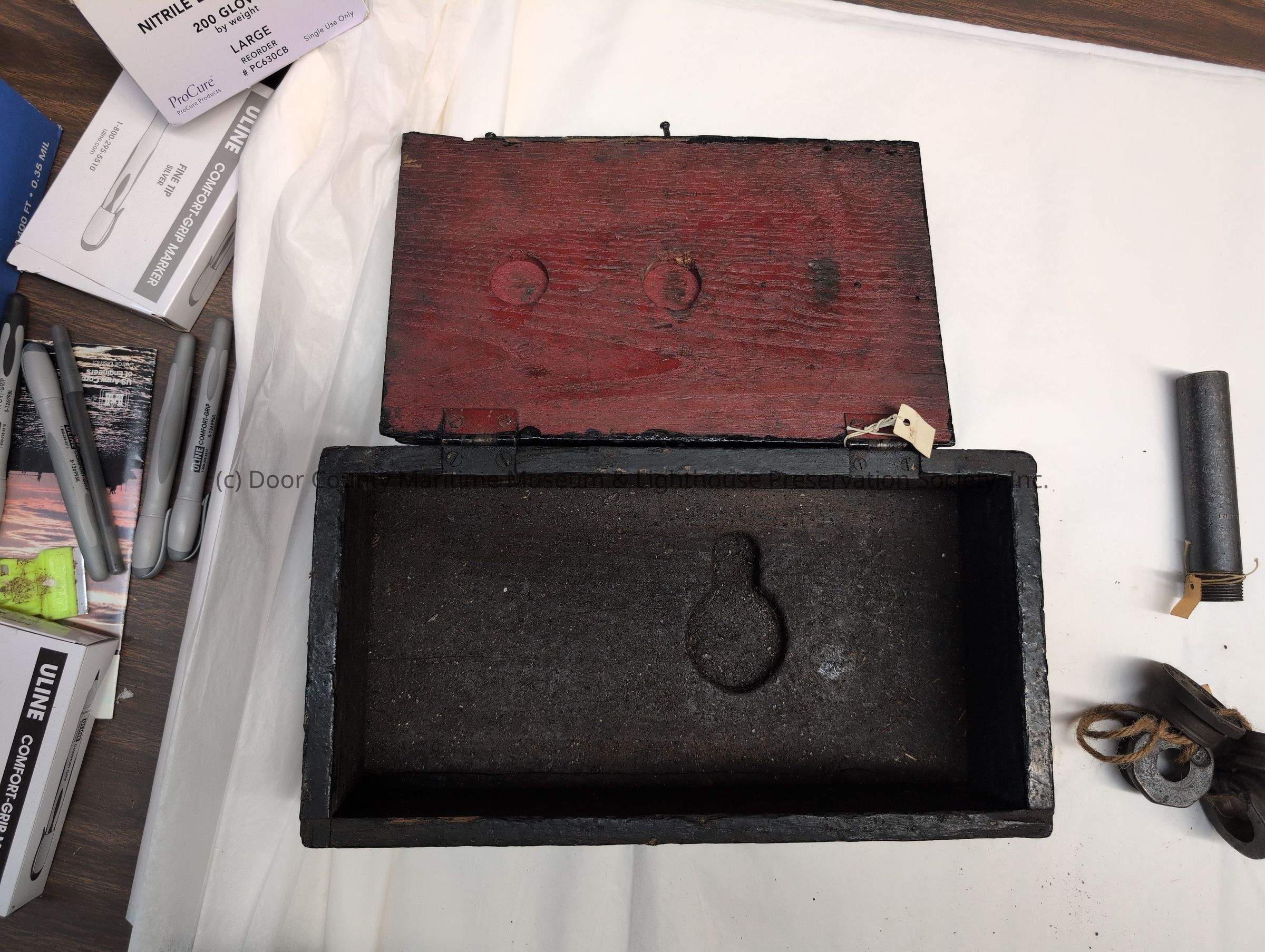 Black with red inside cover. Circle depression in red surface.