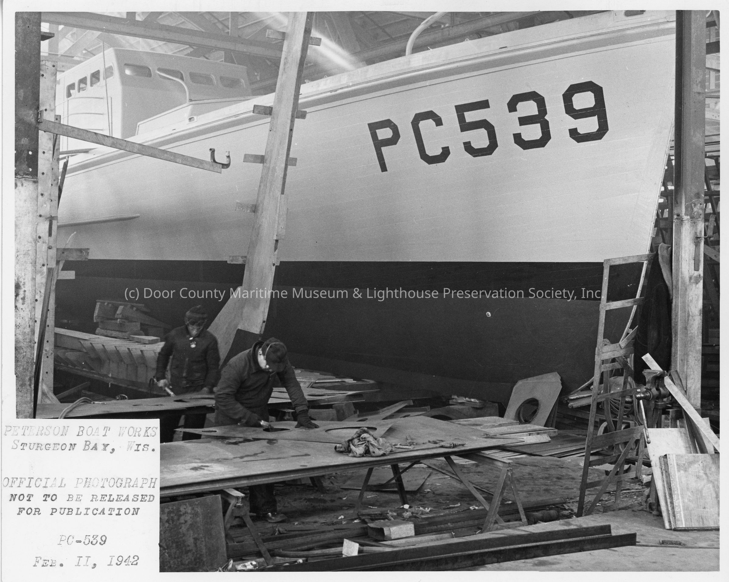 Men working on metal next to PC-539 at Peterson Boat Works February 11, 1942