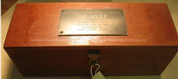 Brown varnish with black nameplate on top cover with white print. Golden metal latch. Green felt inside. Contains red, white, and blue, ribbon covering smashed glass bottle with cork.