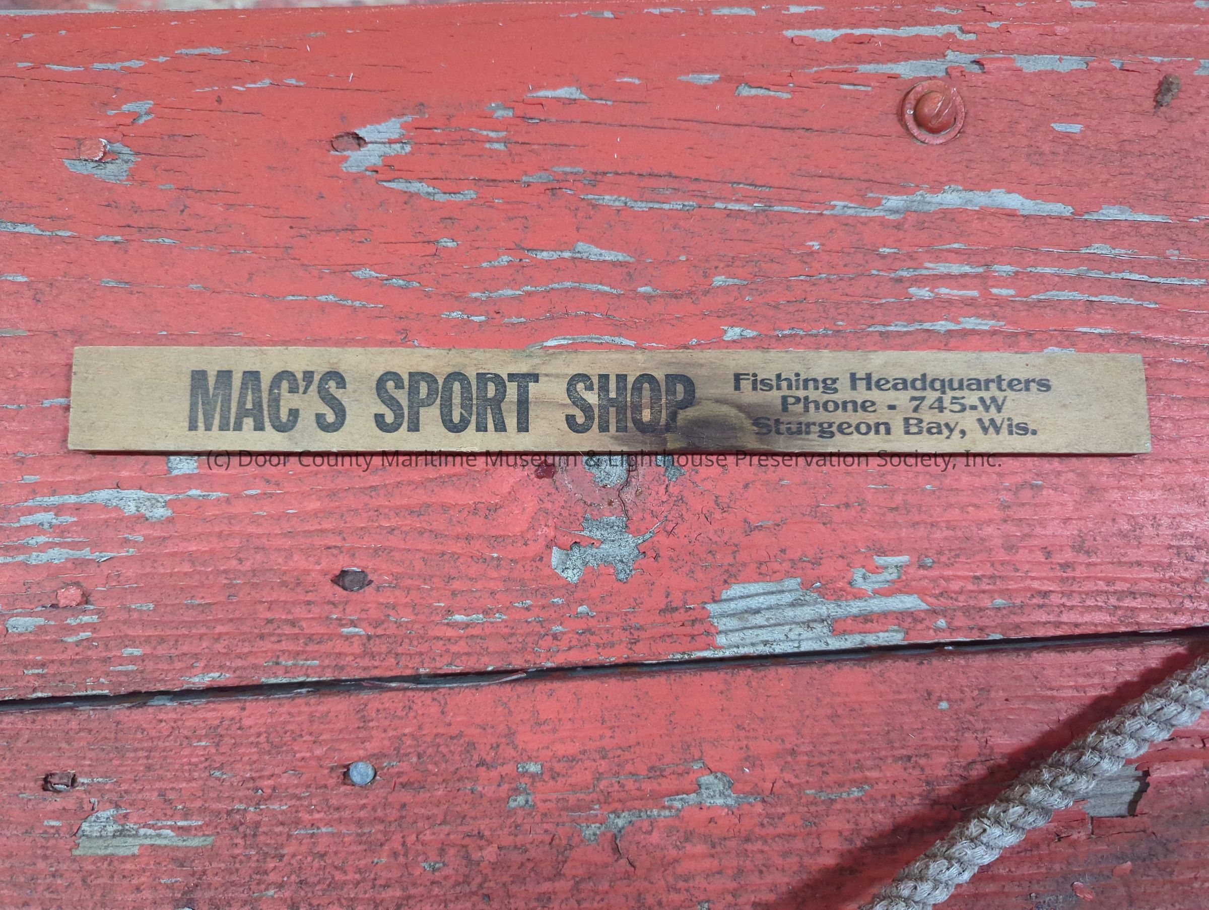Natural wood with black print. One side "Mac’s Sport Shop- Fishing Headquarters, Phone 745 W. Sturgeon Bay, Wis.” Foot long ruler. Other side shows 1951 state laws on fishing