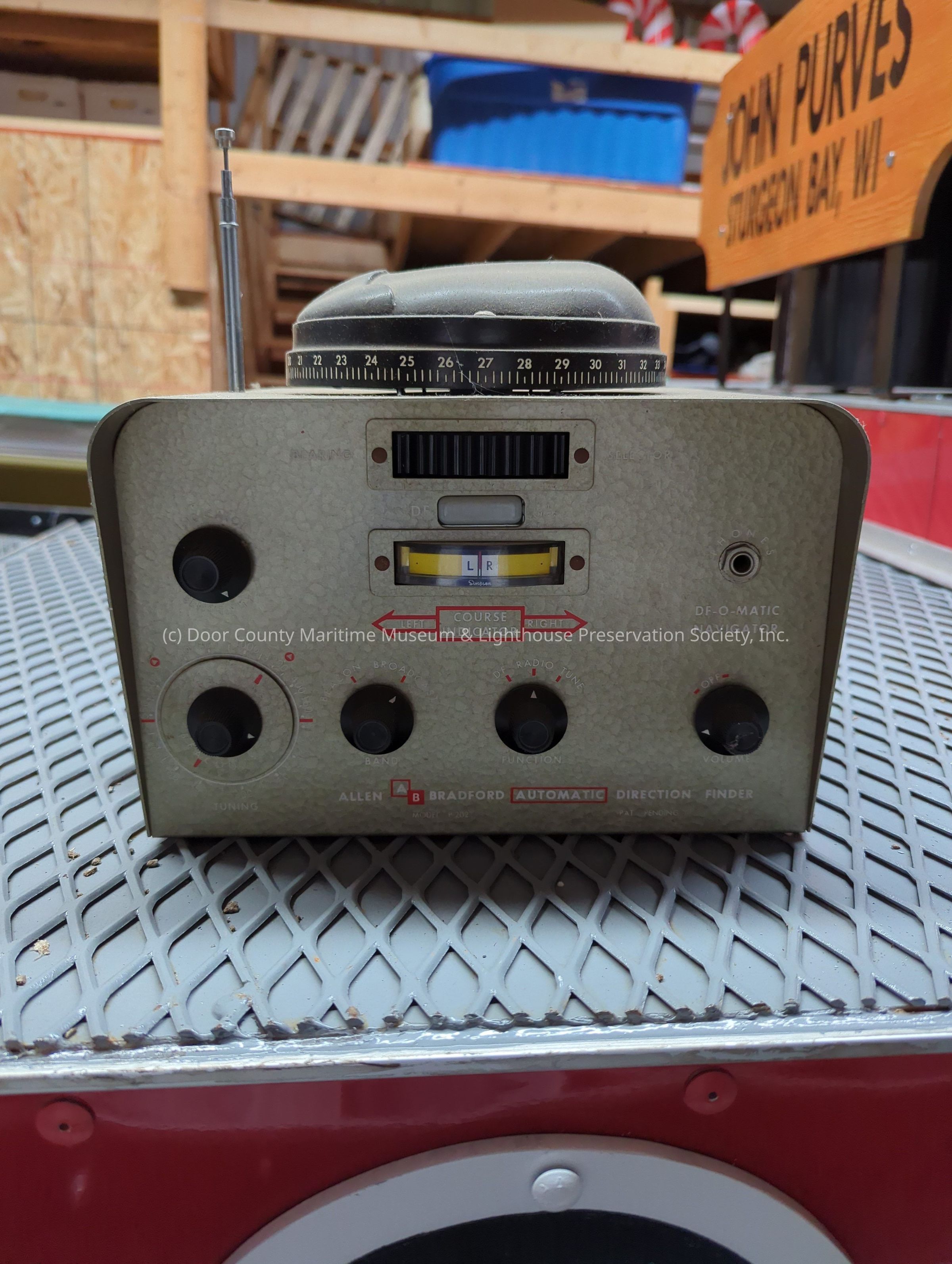 Grey and green with black knobs. Large circular bearing apparatus on top. Silver colored antenna. White and red print. Yellow course indicator. Silver colored handle