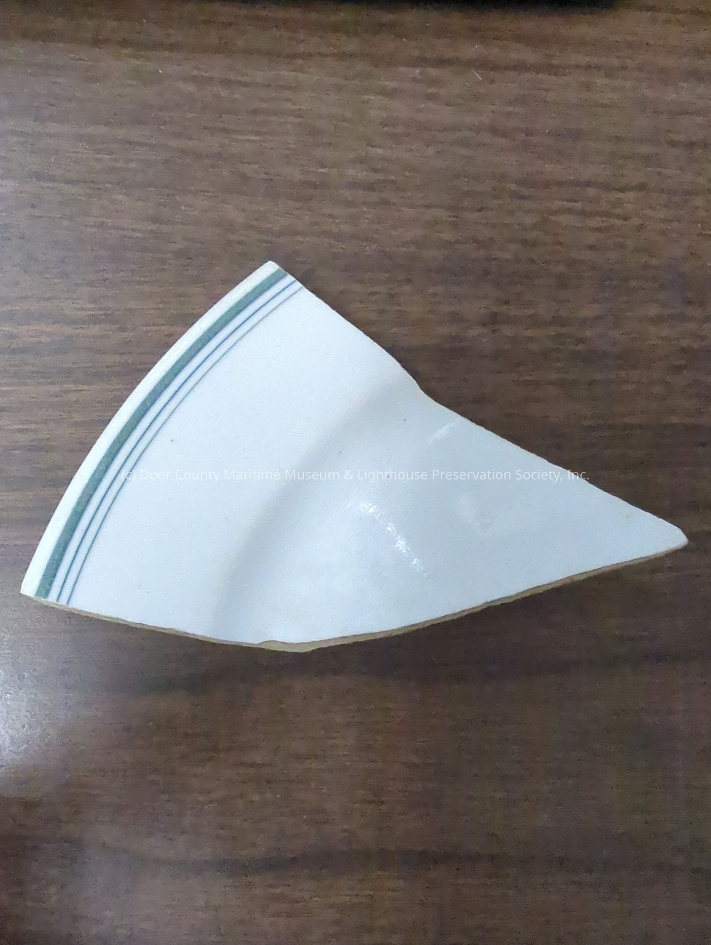 White pottery sherd with three green lines around the rim, one thick, two thin