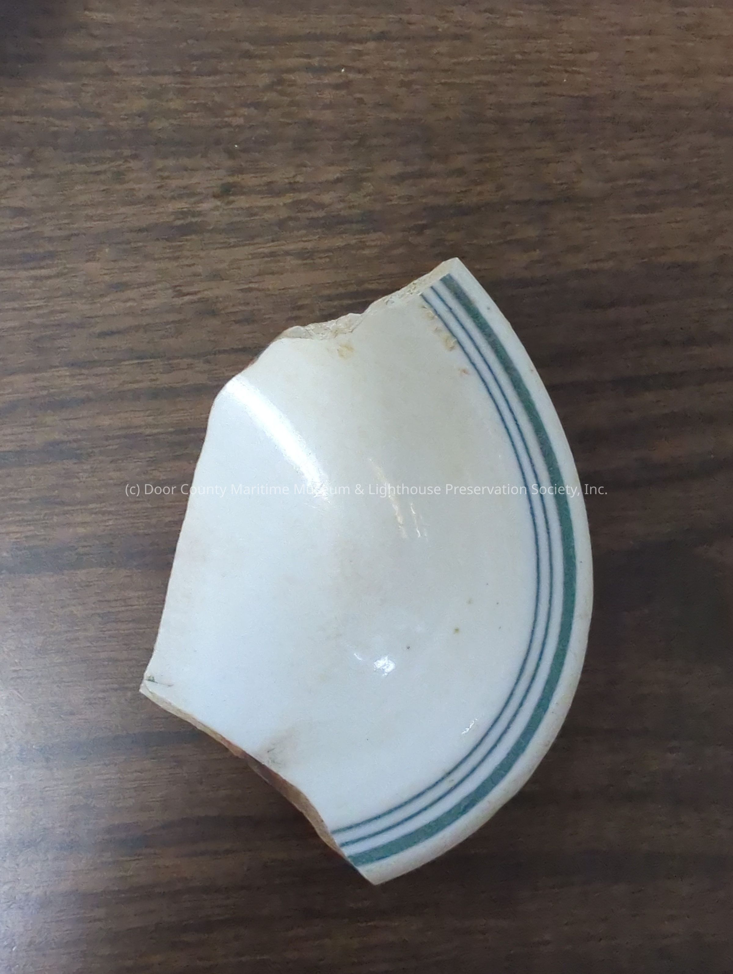 Ceramic fragment with three green lines around rim, one thick, two thin