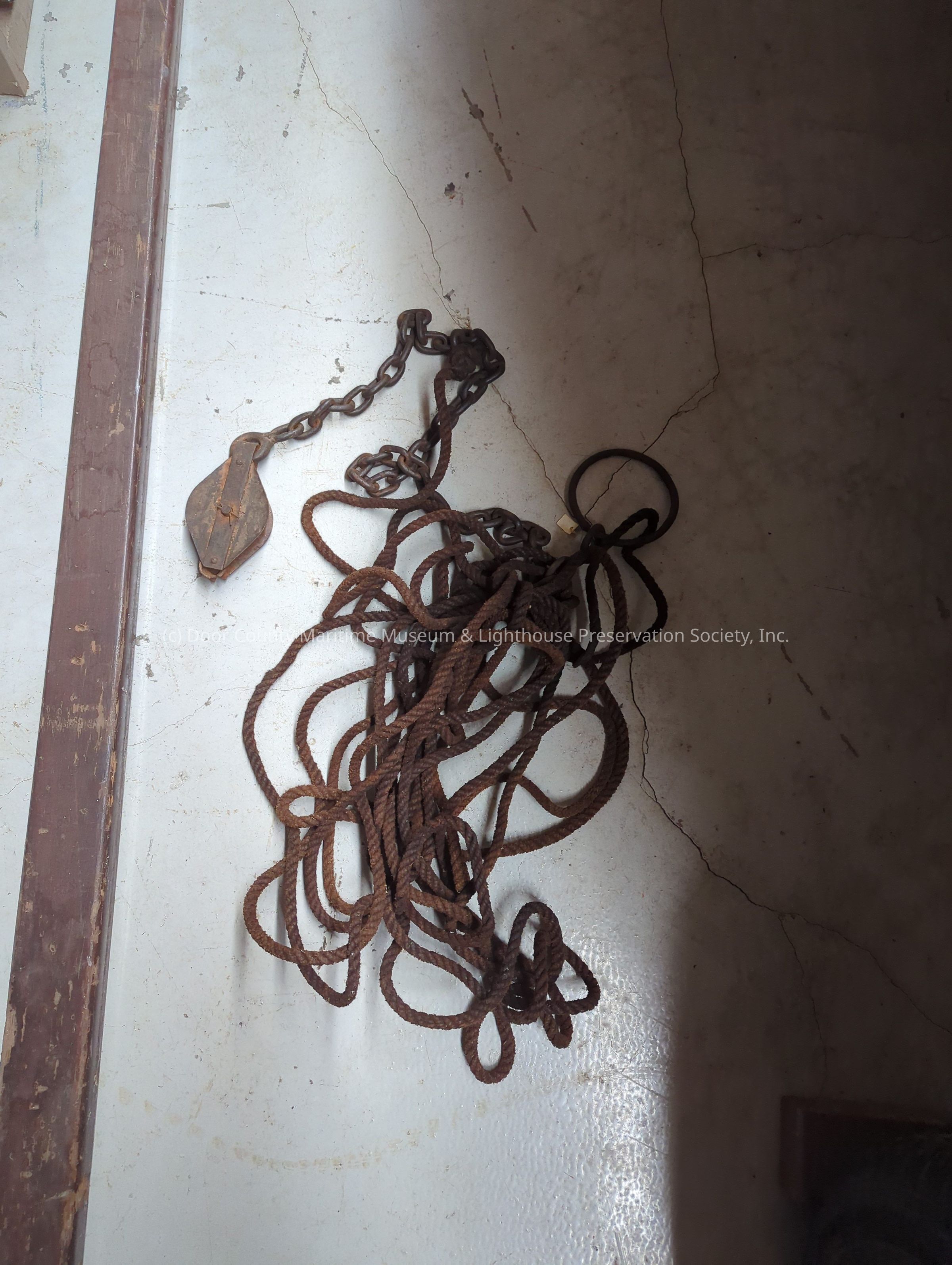 Brown metal with corroded surface. Pulley on one end and a large metal hoop on the other connected by a chain. Brown rope tied around the middle of the chain