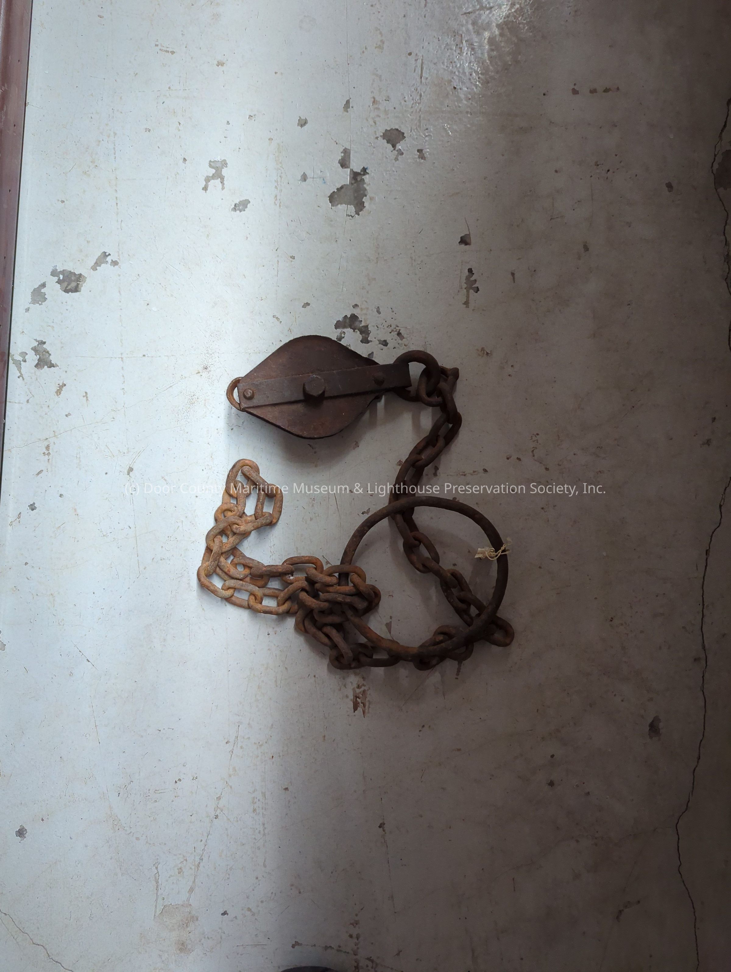 Brown metal with heavy rusty surface. pulley on one end and large hoop on the other connected by a chain