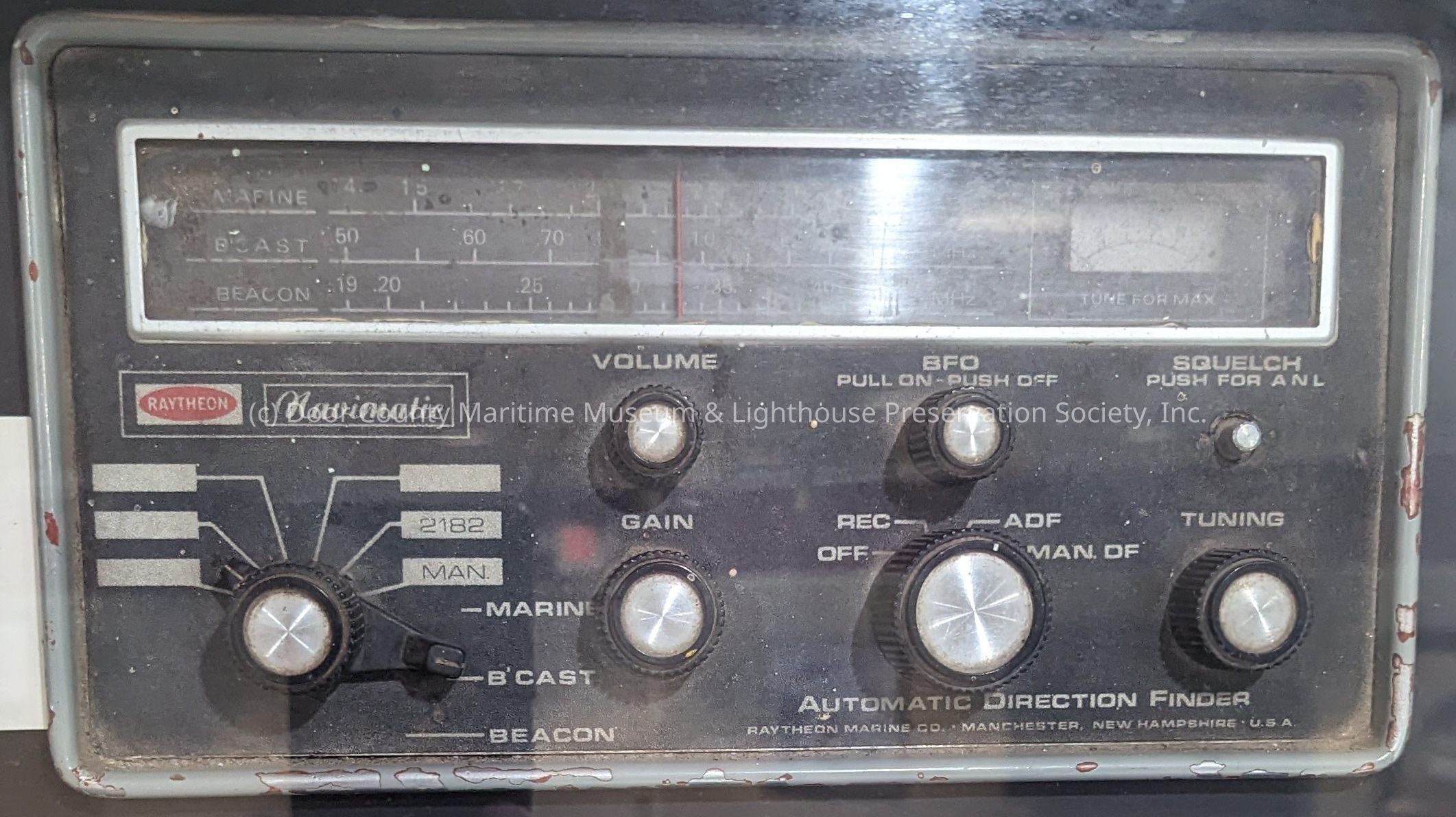Overall color gray with black face and dials; Raytheon logo located on face panel; separate box connected by wires to main housing; separate 86" power cord is generally black with light green paint at various points; ID plate with serial #221447 located on back.Location
