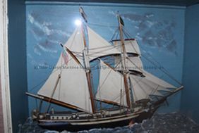original white painted wood; two masted schooner "Cherry Cicerone"; base of case has water replica; black hull; white sails; two life boats; seven figurines; gray deck
