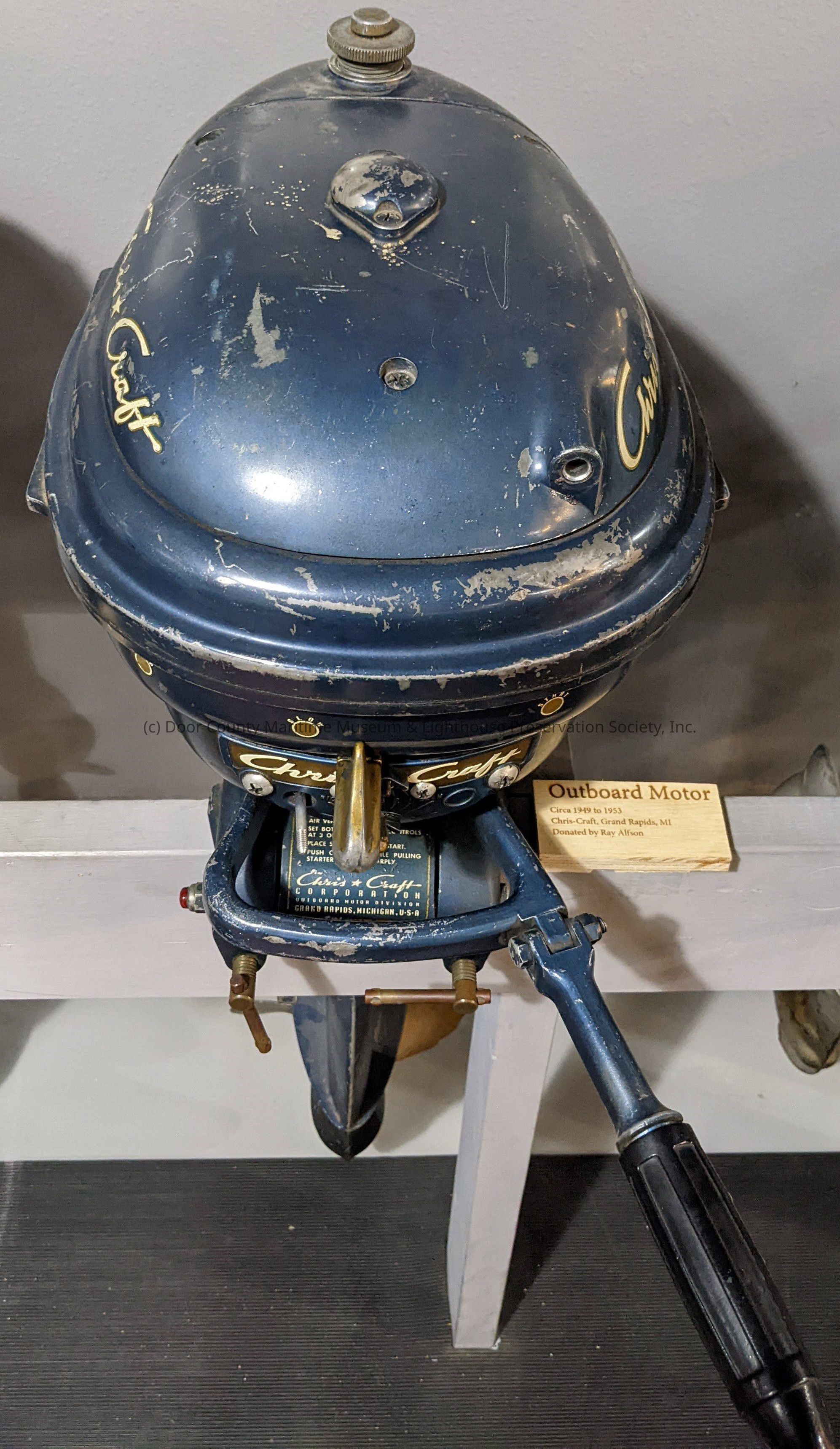 Overall color dark blue with bronze color; 2 blade propeller; white Chris-Craft script copy decals on 2 sides of motor cover; challenger decals fold in color; Chris-Craft script logo (white) on front plate with carburetor settings; gold color throttle lever and choke knob handle on steering arm; 5.5 hpLocation