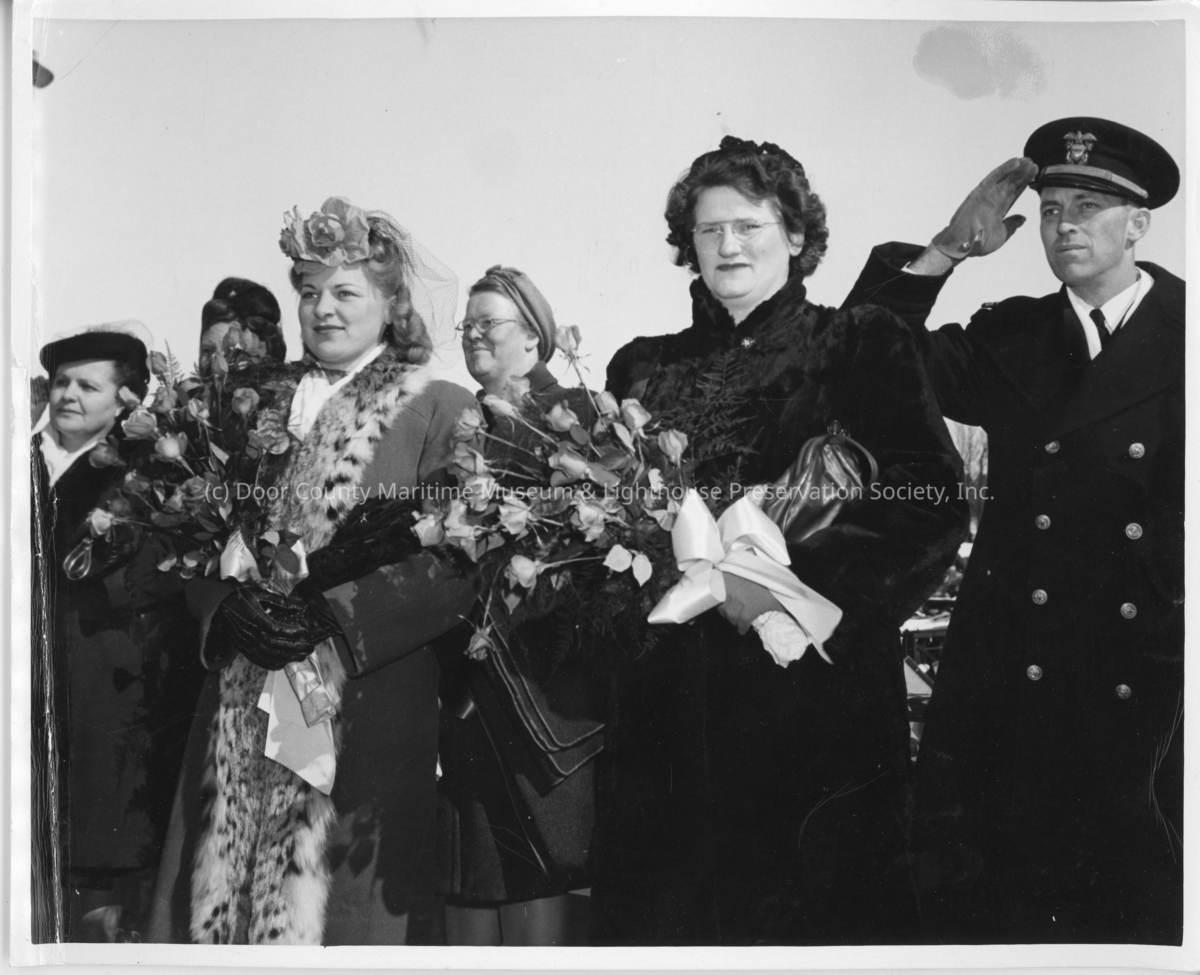 Boatswain J.E. Poston prospective skipper of ship, Mrs. Lester Schroeder co-sponsor, and Lorraine Cunningham co-sponsorLocation