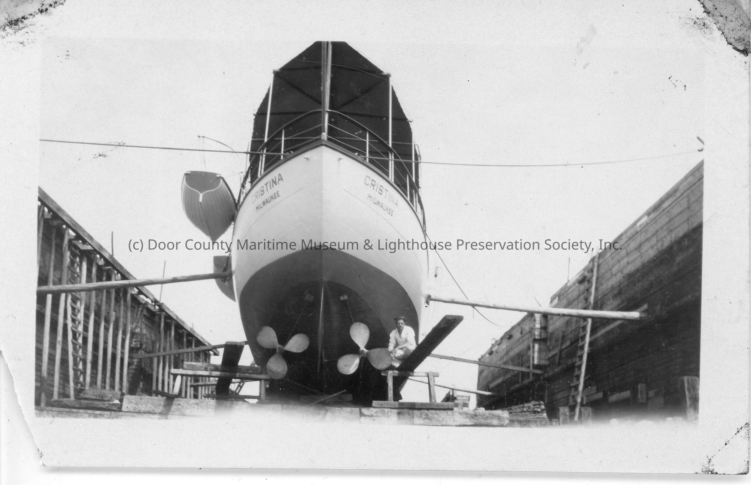 Christina in dry dock with man standing by propellers