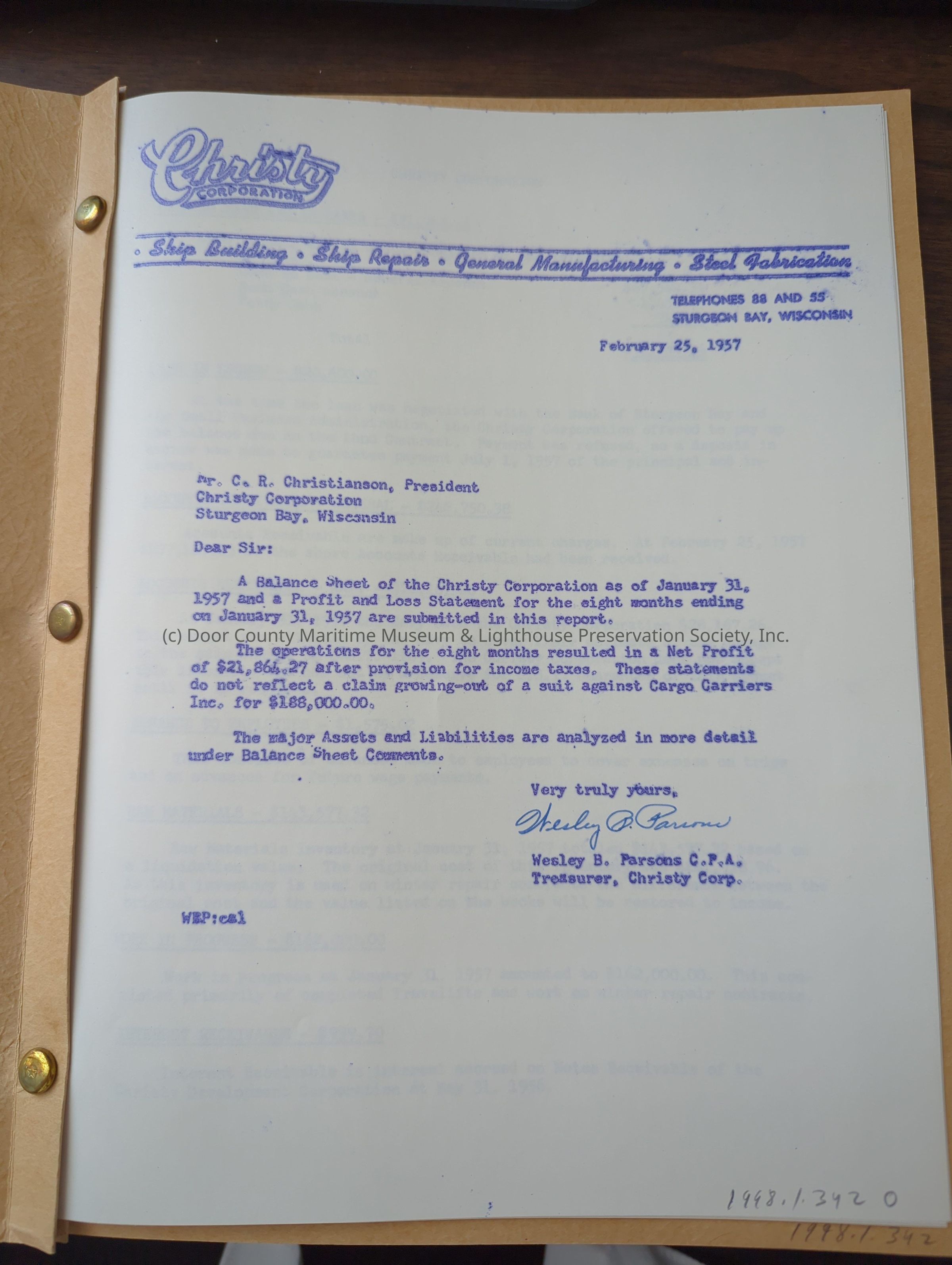 Christy Corp Eight Month Profit Ledger 1956-1957