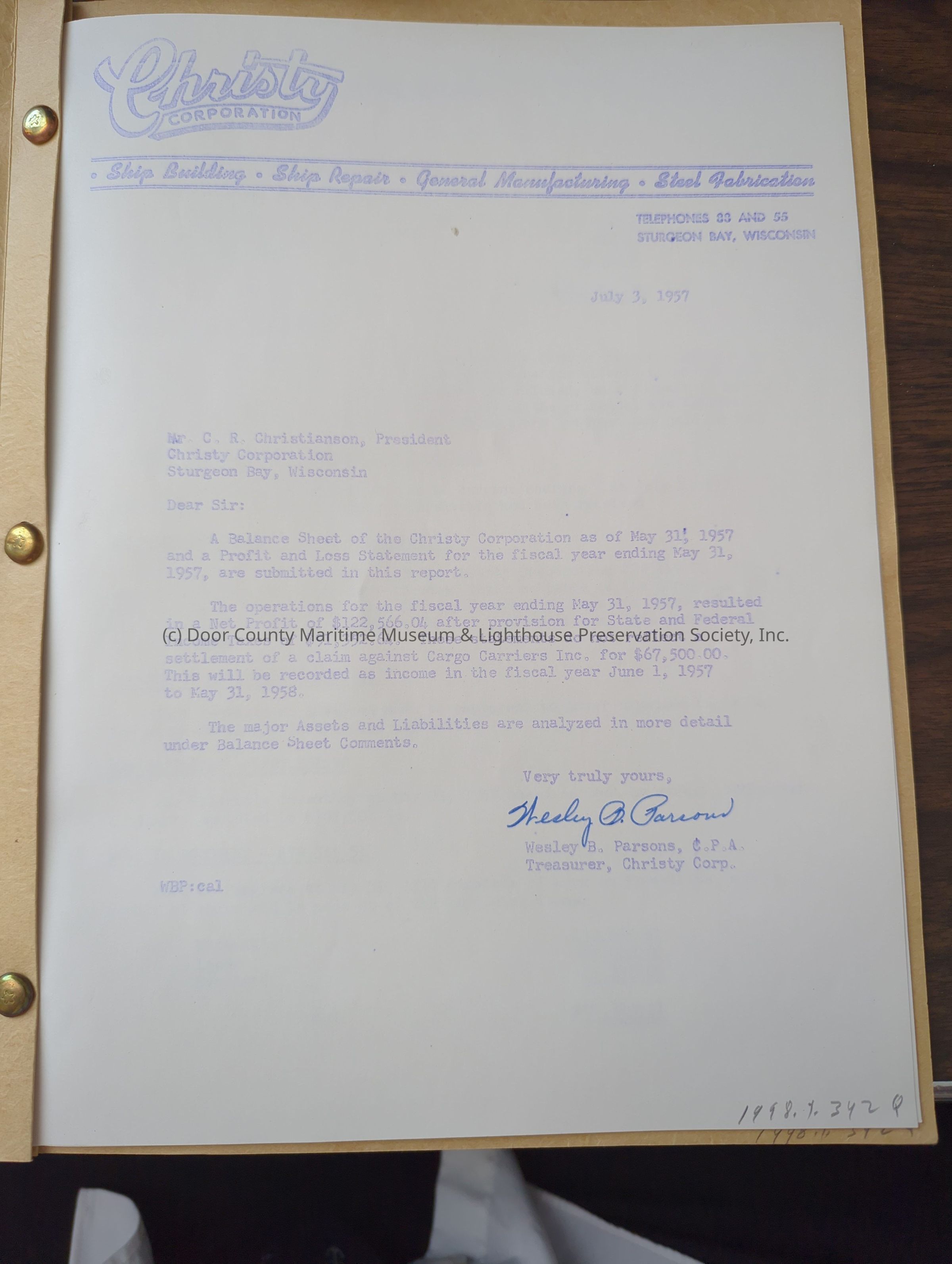 Christy Corp Fiscal Year Profit Ledger 1956-1957