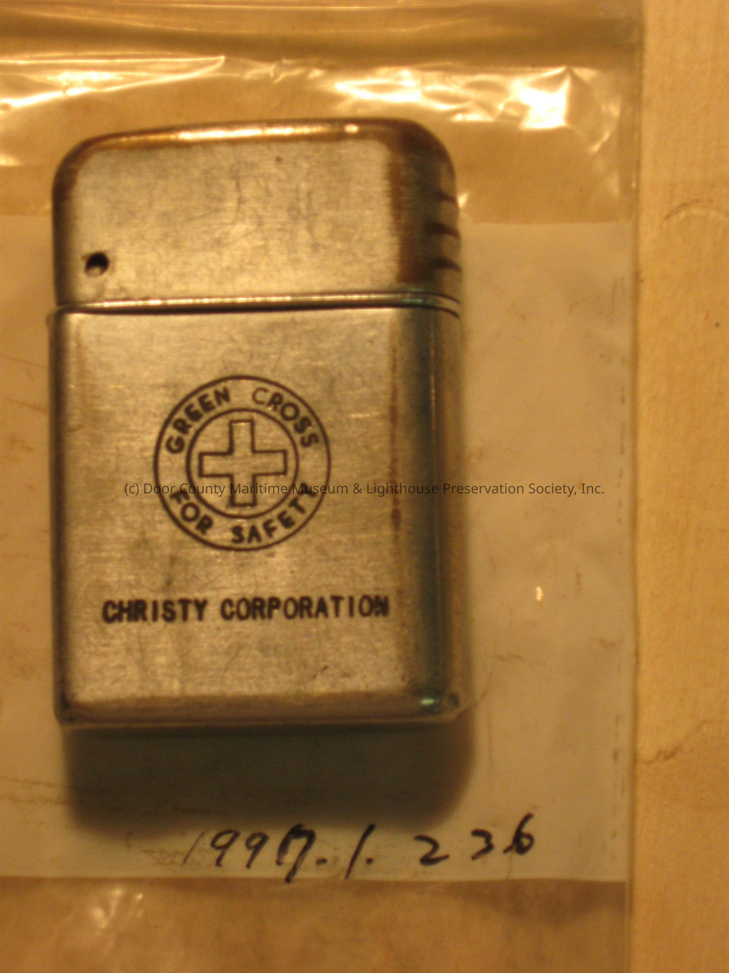 Cigarette lighter, polished metal, worn looking. Green cross with green letters "Green Cross For Safety" "Christy Corp" in read letters.